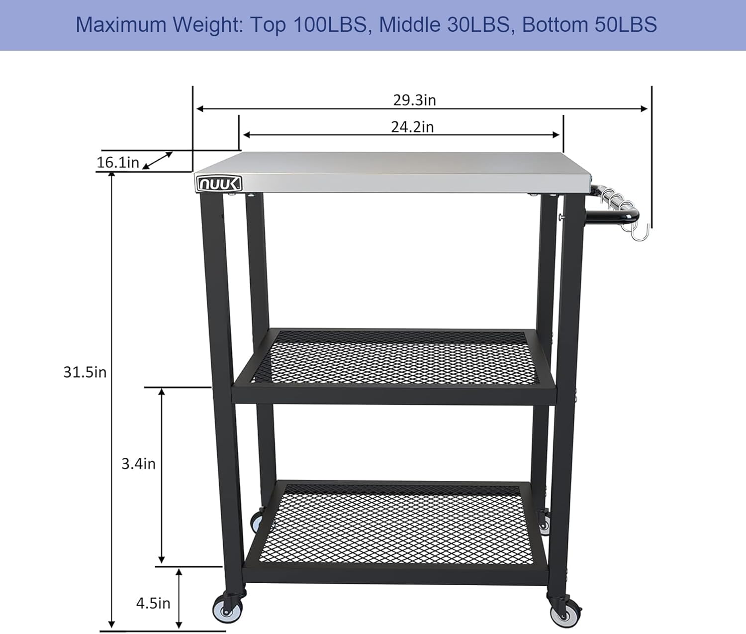 • 【Multifunctional Practical Design】The stainless steel dining table platform is composed of upper, middle, and lower parts, with sufficient space for storing all kinds of tableware, food, and condiments. It has four multifunctional S-shaped hooks and a firm side handle for hanging towels, tableware, and food