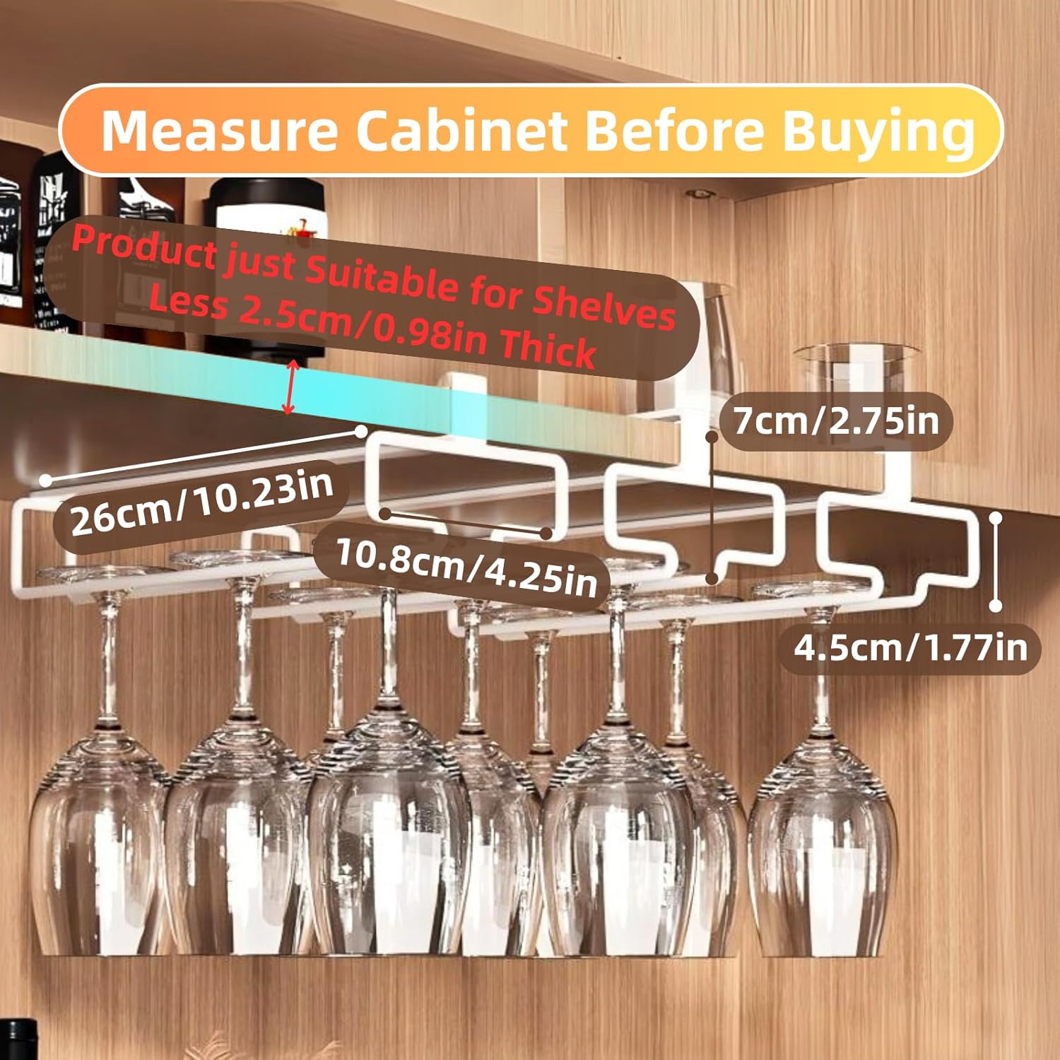 • Compact & Elegant Design: PLEASE MEASURE THE THICKNESS OF YOUR CABINET BEFORE PURCHASING. This wine glass rack's dimensions are: 10.23 in. / 26 cm (Length), 4.33 in. / 11 cm (Width), 2.95 in. / 7.5 cm (Height). This wine glass rack hanger features a hollow-line design that prevents water accumulation and adds an elegant touch, complementing various kitchen and home bar decors.
