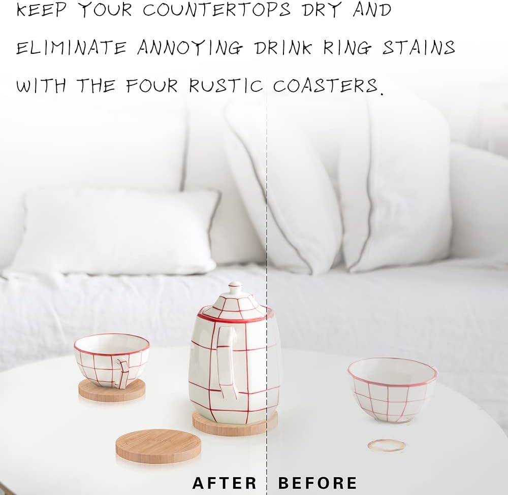 • 【4-COASTERS INCLUDED & RIGHT SPACE】15.78inch dia circular tray; there is ample space to store various items. Plus, carrying multiple items from the kitchen to the living room is a breeze. Keep your countertops dry and eliminate dreaded drink ring stains with the four gorgeous rustic wooden coasters.