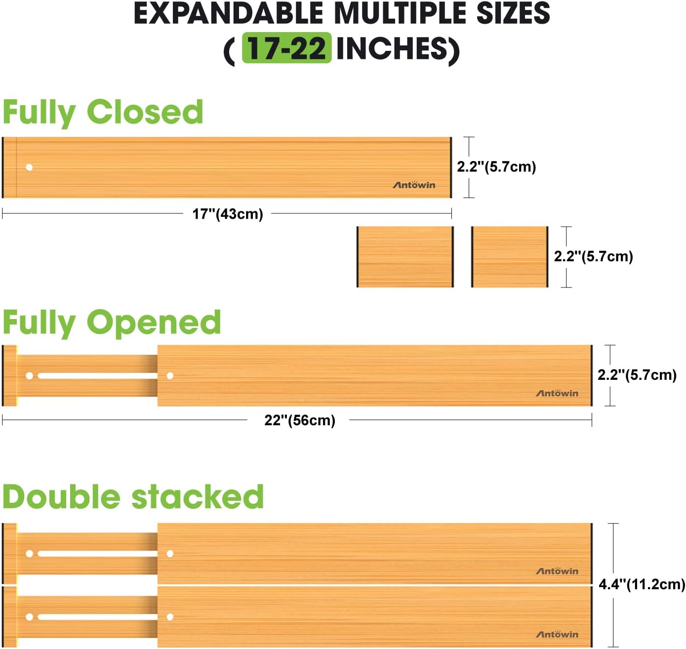 • ORGANIZED DRAWERS: The drawer dividers from ANTOWIN are the best way to avoid a mess in the kitchen, bathroom, bedroom or elsewhere in your home or office. These bamboo drawer separators will help you keep everything organized and tidy at all times!
