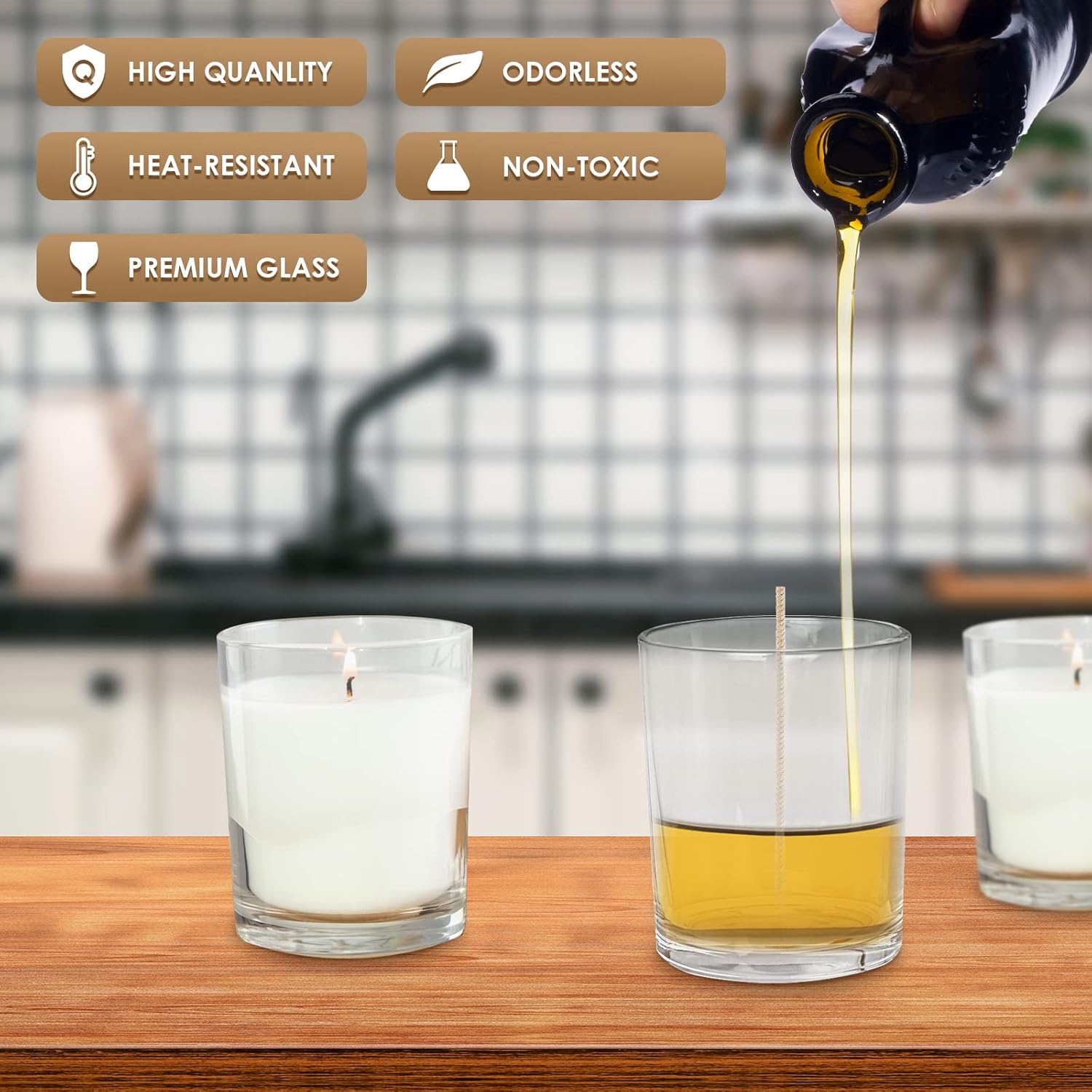 • Airtight Bamboo Lids: Each jar comes with a bamboo lid equipped with a silicone sealing ring, creating a tight, airtight seal. This keeps your candles fresh and locks in the fragrance, preventing exposure to air.