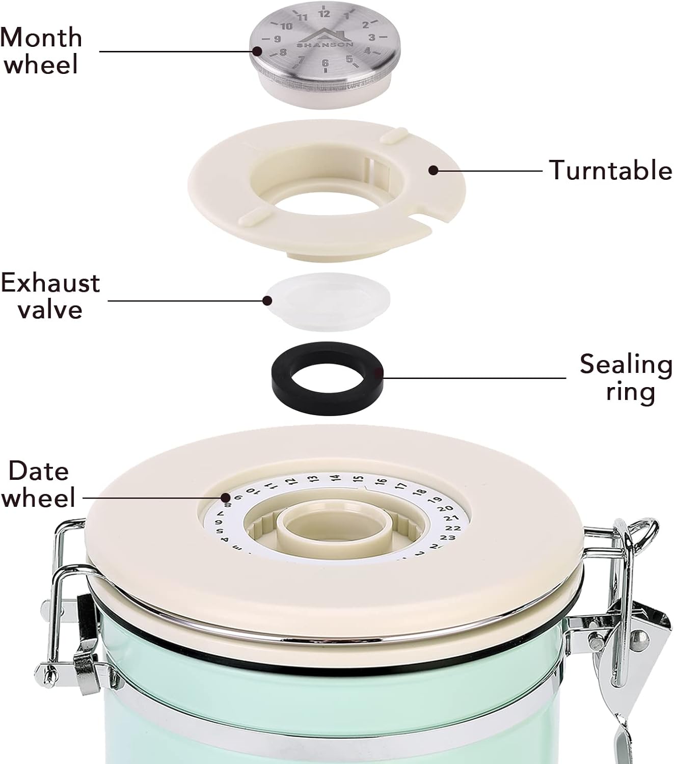 ShanSon Coffee Canister Airtight Coffee Container Stainless Steel Coffee Bean Storage Container with CO2 Release Valve and Scoop Coffee Canister for Beans,Grounds,Sugar,Flour,Tea,Cereal,22OZ,Green