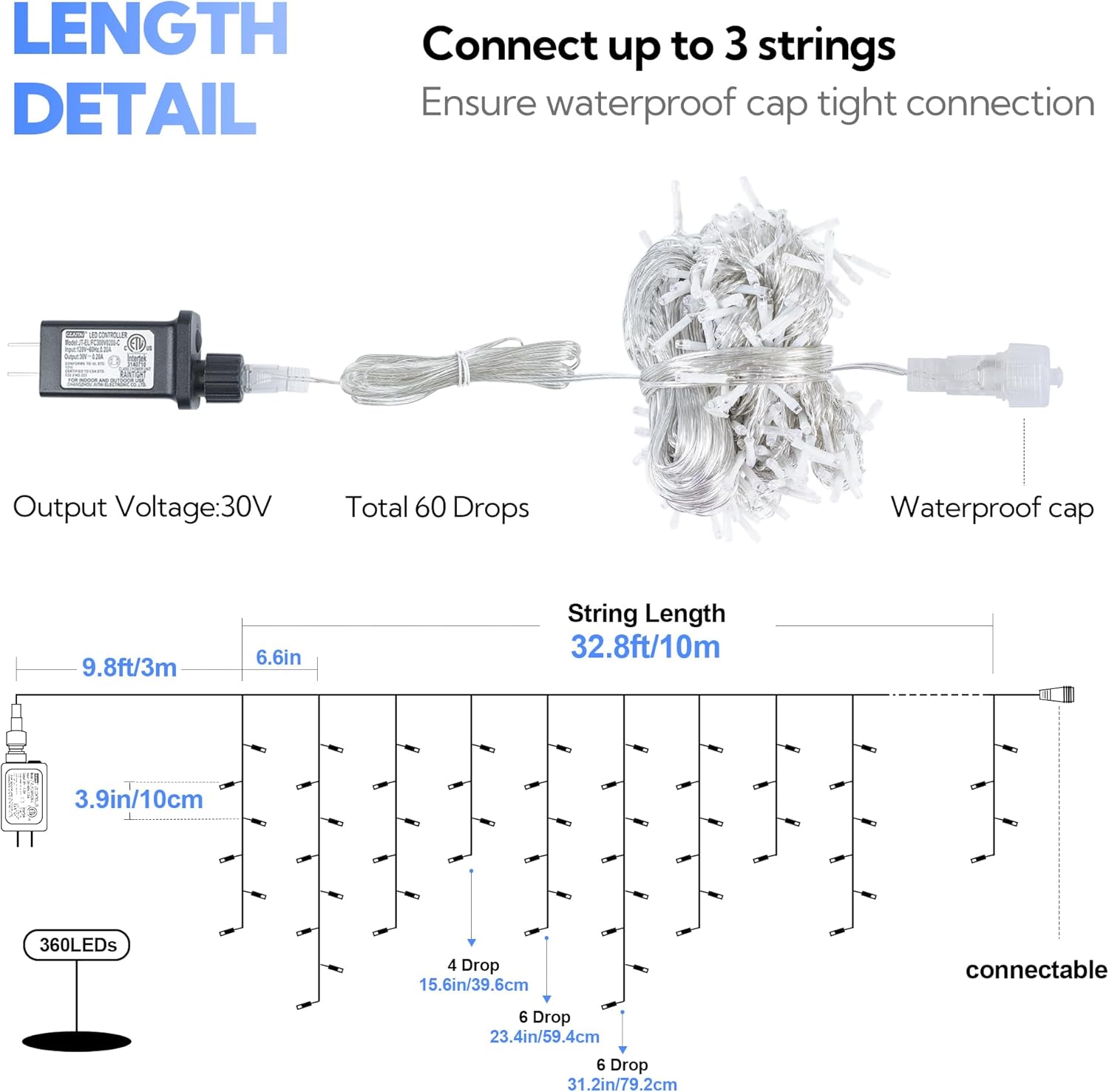 • 💗【Connectable for Wide Use】: Our icicle Christmas lights adopt 360L bright led bulbs,42.6ft/ 13m long in total with total 60 drops.Drop lengths 16''- 24''- 31''- 24'', number of light bulbs is 4, 6, 8, and 6 respectively. The outdoor string lights is extendable,can maximum connect with 3 sets.clear wire looks simple but dreamy.You can hang them on roof, hedge, fence, prom, patio, eave, handrail etc, creating romantic atmosphere for wedding,party,Valentine's Day,Christmas,New Year.