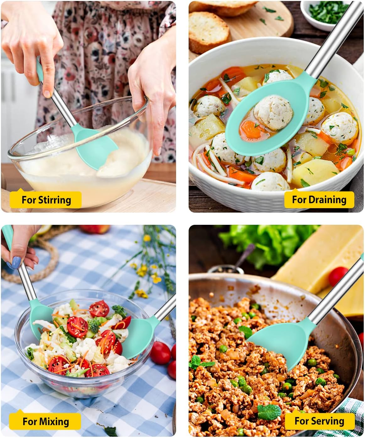 • Just Want To Provide The Ideas For You : Large cooking spoon used to hold food more convenient; Slotted Spoon can quickly drain the water; Whether it is used for draining or serving food, our large silicone cooking spoon will add more fun to your kitchen