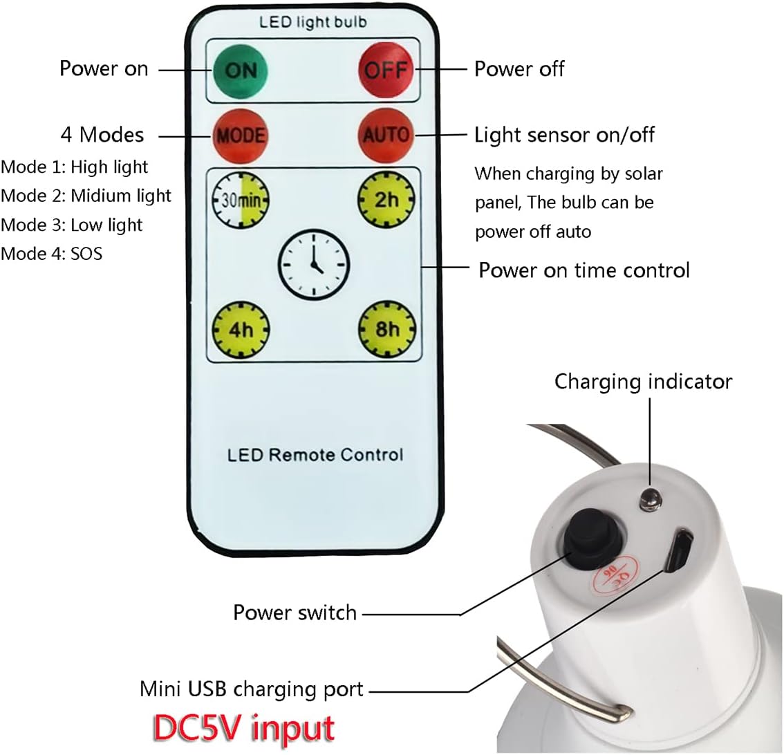 • Two Way Charge: The light bulb can be charged by the solar panel or DC 5V adaptor by USB cable, it can keep lighting for 4-6 hours after fully charged.LED lifespan is 50000H. When charging by solar panel: please put the solar panel outside under the sun and keep the solar panel facing the sunshine directly.At the same time connect the bulb with cord to the bulb for 5-8 hours, charging indicator is red when charging, full charged still red.(5-8V power adaptor for charging as well) .
