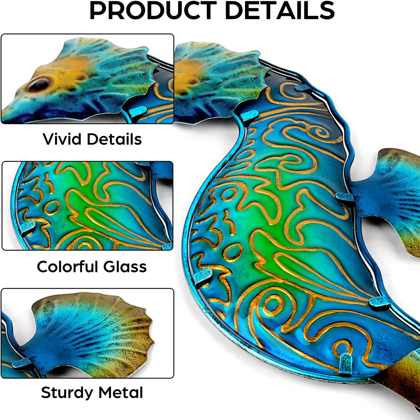 • Product Details - You will get include 1 piece seahorse decoration - Measure 15.9 x 7.9 inches. The vivid metal seahorse wall decor matches is perfect for any decor style and can be displayed in bedroom, living room, office, study, baby room, kitchen, yard, porch, patio, garden and more