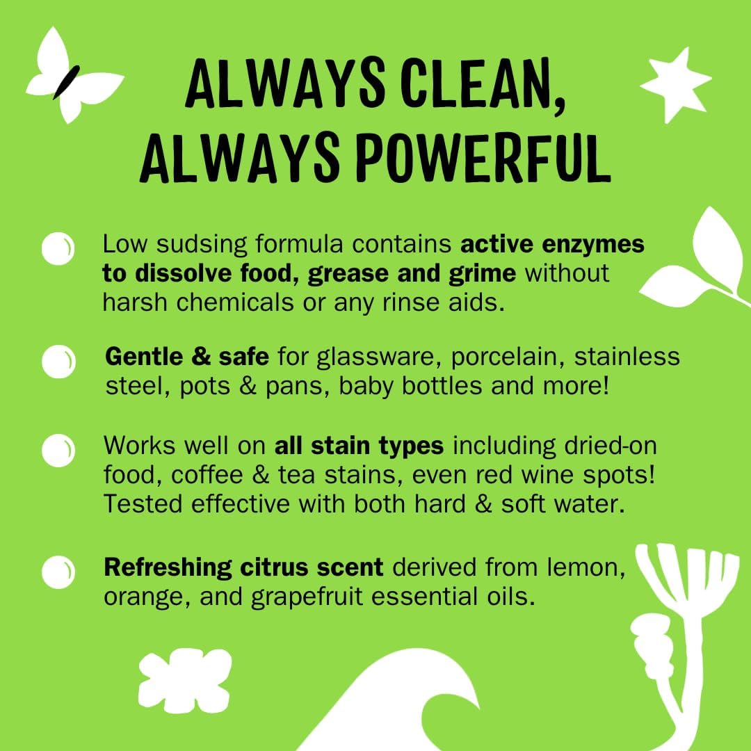 • POWERFUL YET GENTLE: Low sudsing formula contains active enzymes to dissolve food, grease & grime without the need for harsh chemicals or any rinse aids. Works well on all stain types including dried-on food, coffee & tea stains, even red wine spots! Effective with both hard and soft water.