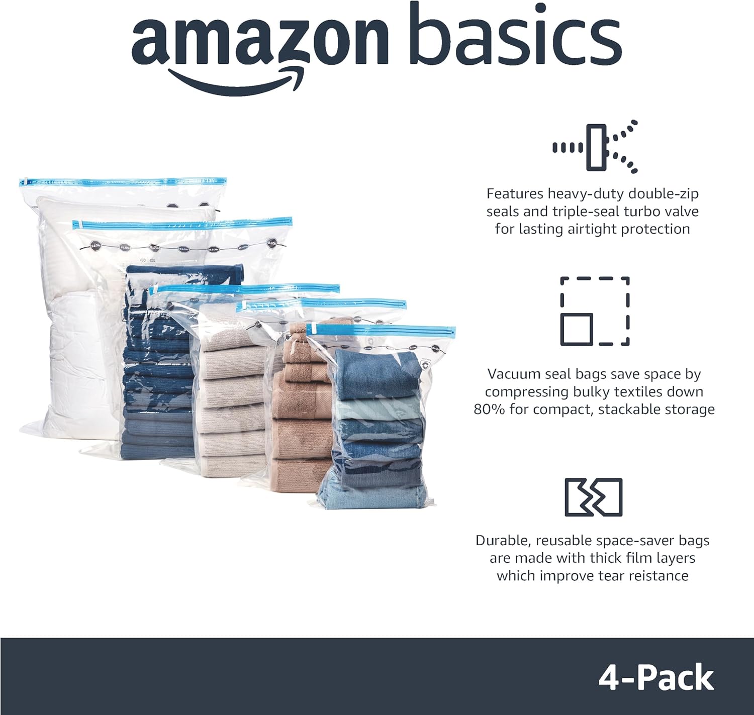 Amazon Basics Vacuum Compression Space Saving Storage Bags with Hand Pump for Clothes Packing, Ideal for Blankets, X-Jumbo Pack of 4