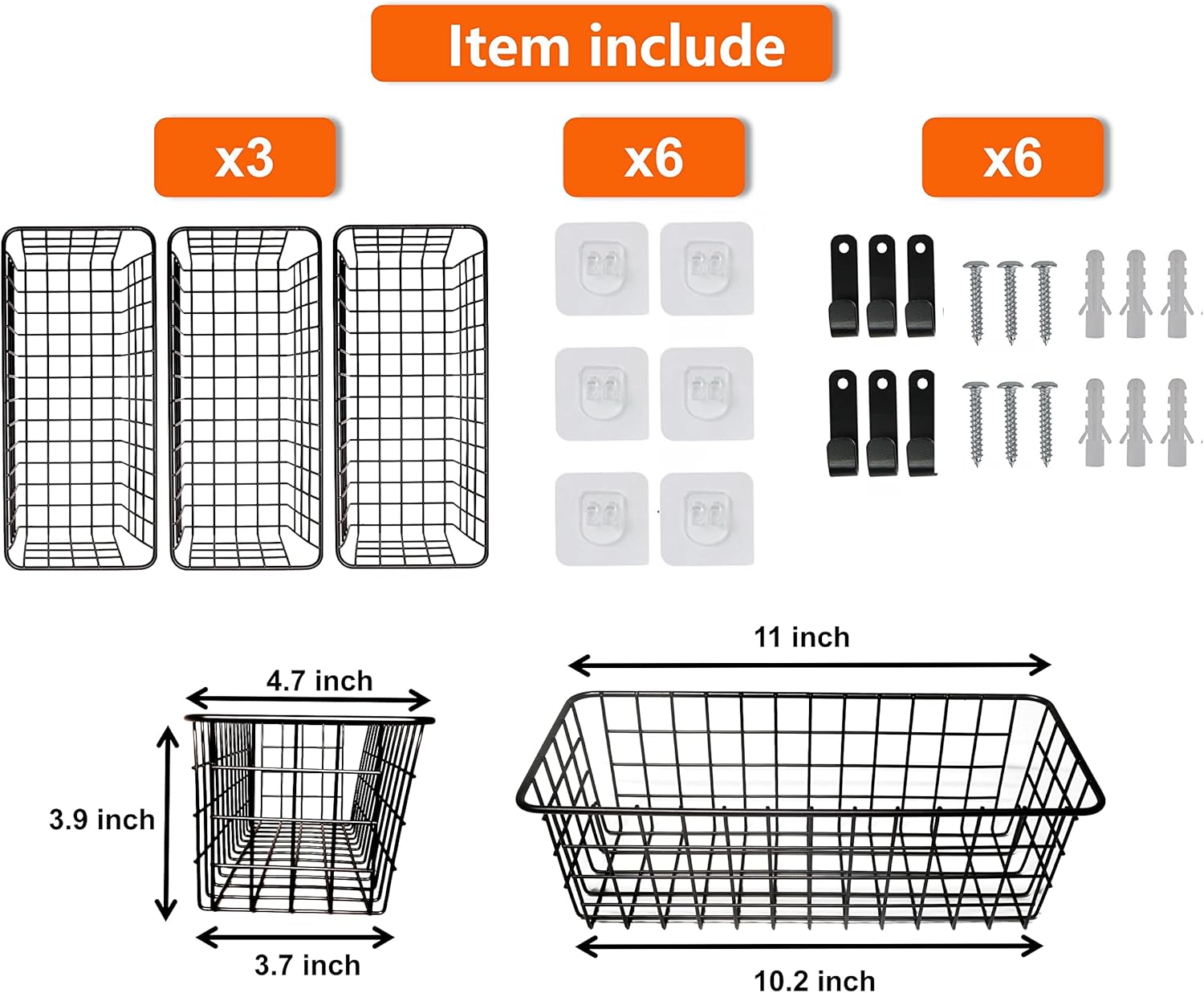 • 🍎【Sturdy wire baskets that can hold 40 pounds】 These baskets are made of durable steel wire with durable anti-rust and anti-corrosion coating, as well as wall-mounted hardware and hooks, which can hold 40 pounds. (Note: If you use non-marking paste instead of screws, the basket can hold 10 pounds)