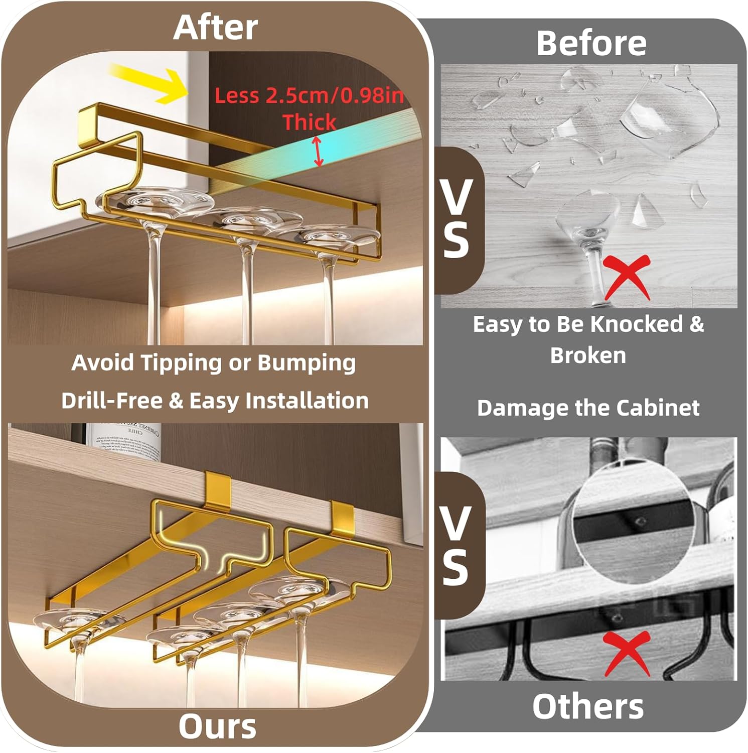 • Drill-Free & Easy to Install: No drilling is required. This wine glass rack can securely hold your wine glasses without worrying about accidental slippage or falling. The smooth black finish prevents any scratching or chipping on the surface of the wine glasses. It's very easy to clean and not easily stained.