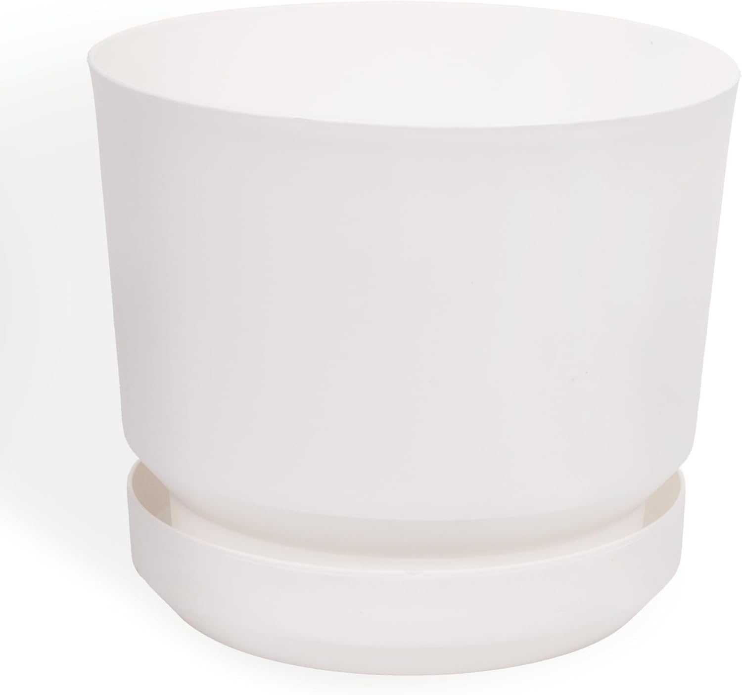 Elly Décor 10 inch Plastic Cylinder Planter Pot with Self-Watering Saucer and Drainage Hole,Lightweight & Extremely Durable, 10"x 10", White