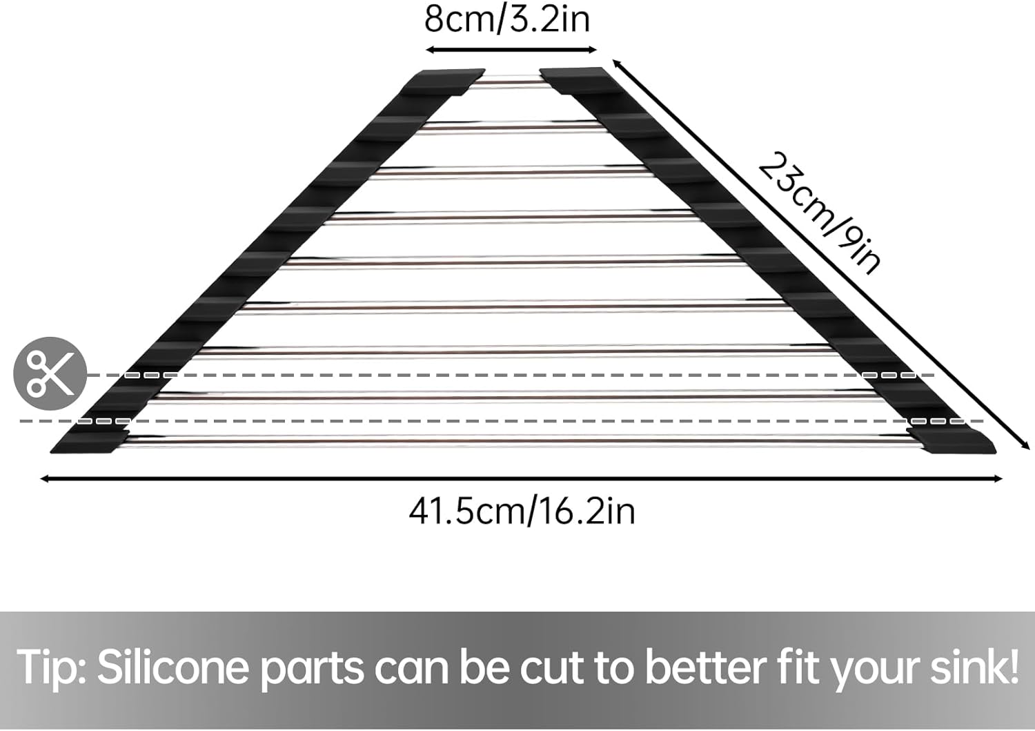 • ✔️【Space Saving】This over-sink dish drying rack takes up little space and the foldable design allows you to quickly roll it up for easy storage and make your kitchen look less cluttered. It is the best cutlery drainer for your kitchen and can replace bulky dish racks and colanders. Suitable for most standard sinks and drawers. Please kindly check your sink size before purchasing.