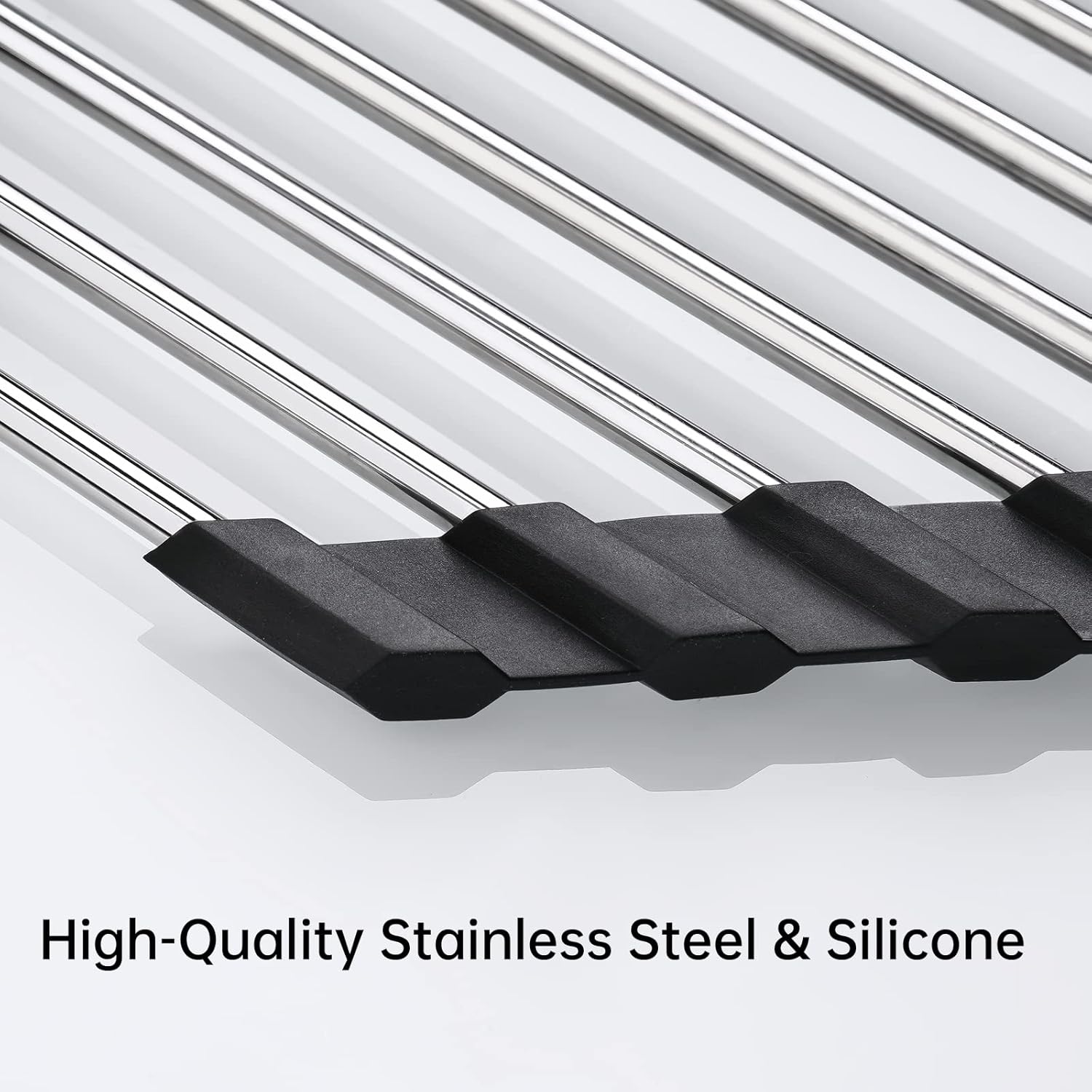 • ✔️【Food Grade Materials】Made of premium quality SUS304 stainless steel and BPA-free food safe silicone edges, this drying rack is waterproof, rust-proof, durable and scratch-resistant. Solid construction with non-slip silicone ends securely attached to stainless steel rods.