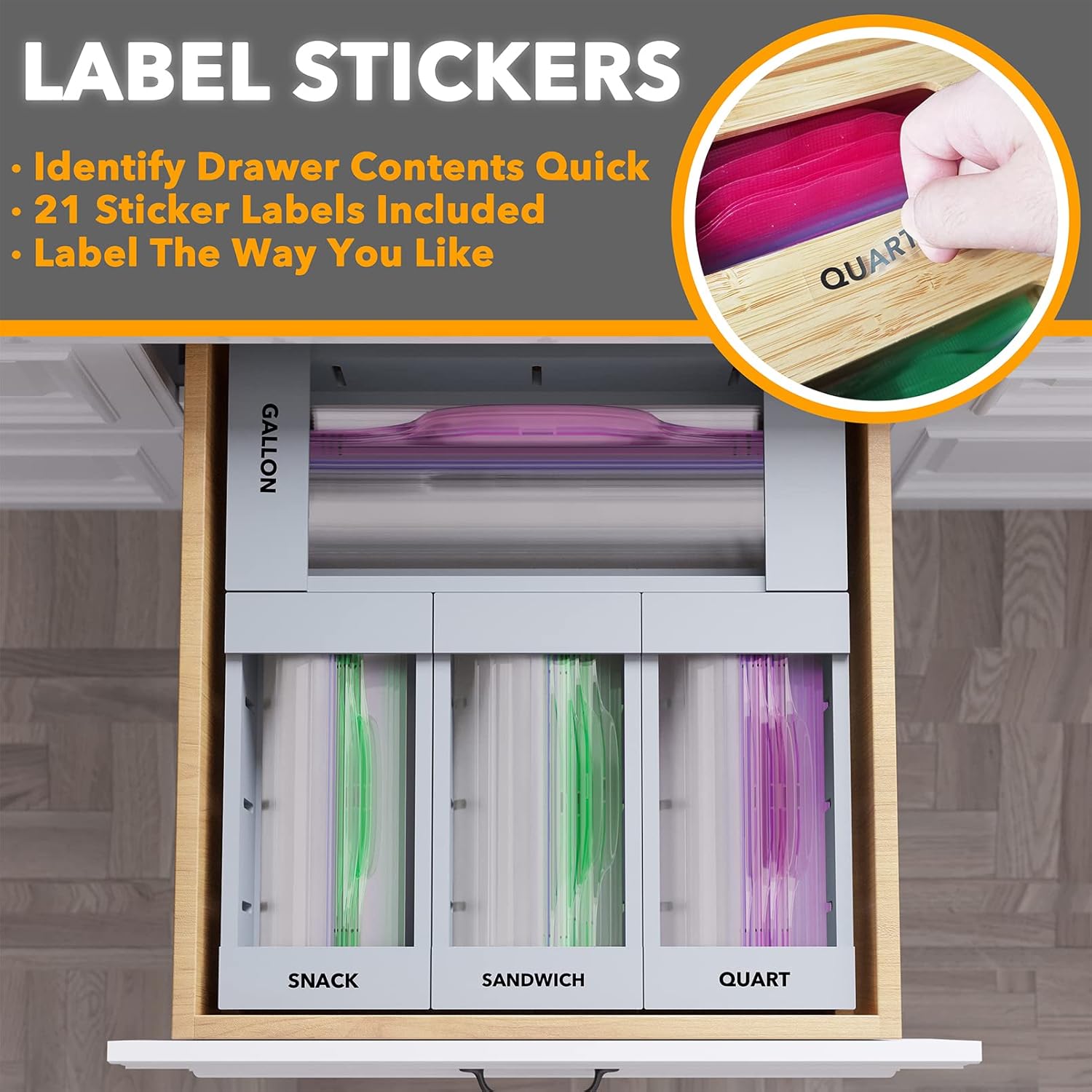 • No Assembling Needed: Our gray bamboo organizer box comes fully assembled easy to use; Size: 12 x 5 x 3 inches (1 pcs) for Gallon, 8.7 x 4 x 3 inches (3 pcs) for Sandwich, Quart & Snack; USPTO Patent Pending