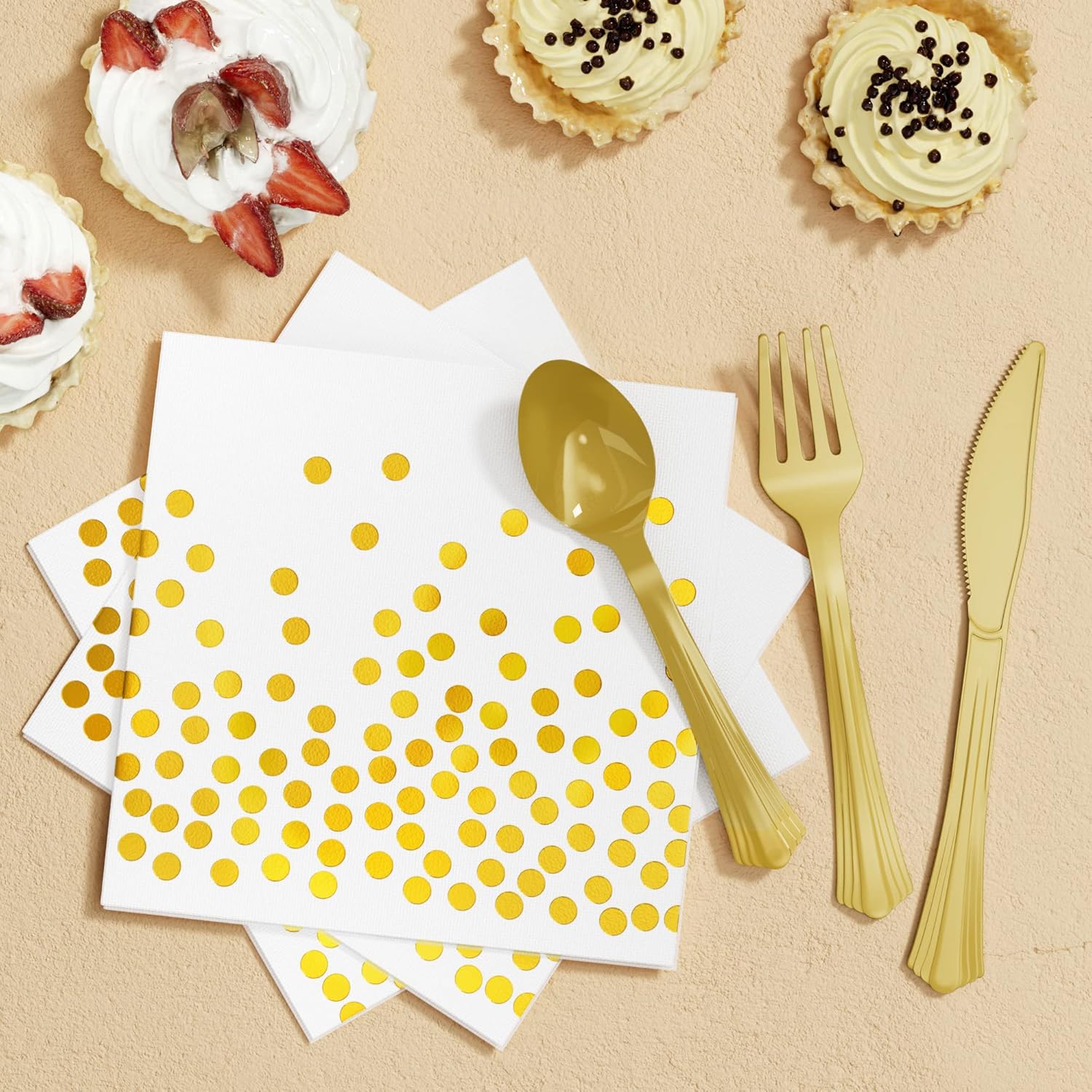 • WHITE AND GOLD PARTY SUPPLIES: These attractive golden foil dot on white party dinner paper plates, dessert plates, cups, napkins sure to be loved by everyone. Along with golden plastic forks knives and spoons, which festive atmosphere to the celebration. The whole set presents an understated luxury texture that adds a sophisticated elegant, modern feel to your party. Perfect choice for a white and golden Sweet Happy any themed party.