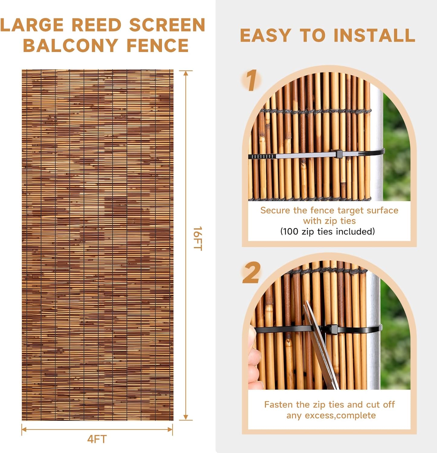 • 【EASY INSTALLATION】- Attach this Screen to any old chain link, wire/wooden fence, railings or other fence types with cable ties. Package includes 1 natural reed fence and 100 zip ties (Size:16.4ft x 4ft)