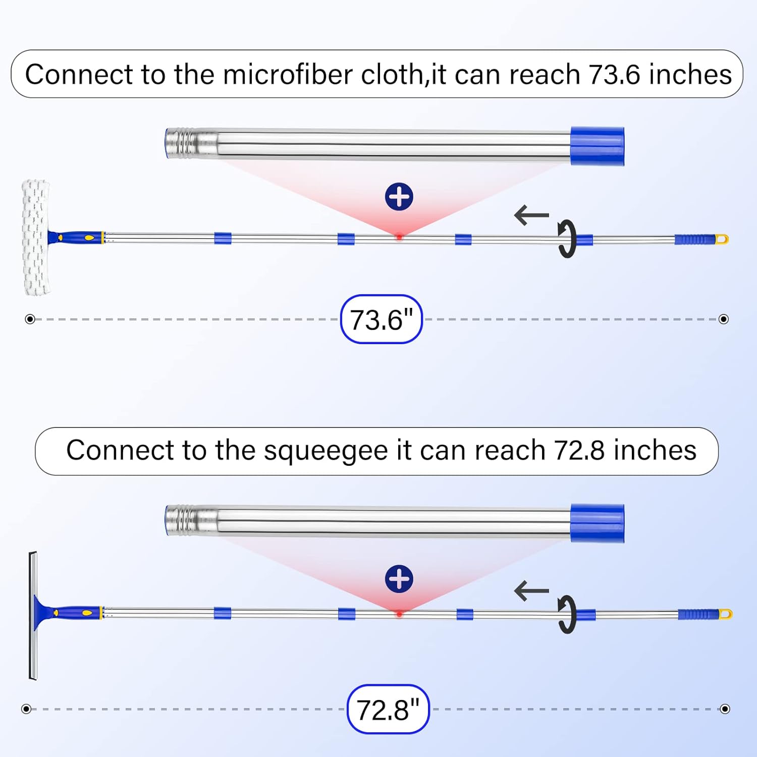 • Easy to Assemble: Just screw on the poles to complete the installation (The last section of pole is extension pole). The squeegee handle can be adjusted from 45"to 73". Meet various height requirements for you to clean the truck or high window. When you don't use the window squeegee, you can disassemble and store it. The microfiber pad of the long-handled squeegee can be removed to support both hand &machine washing. 2 sets of rods, no need to replace it between squeegee and microfiber cloth.