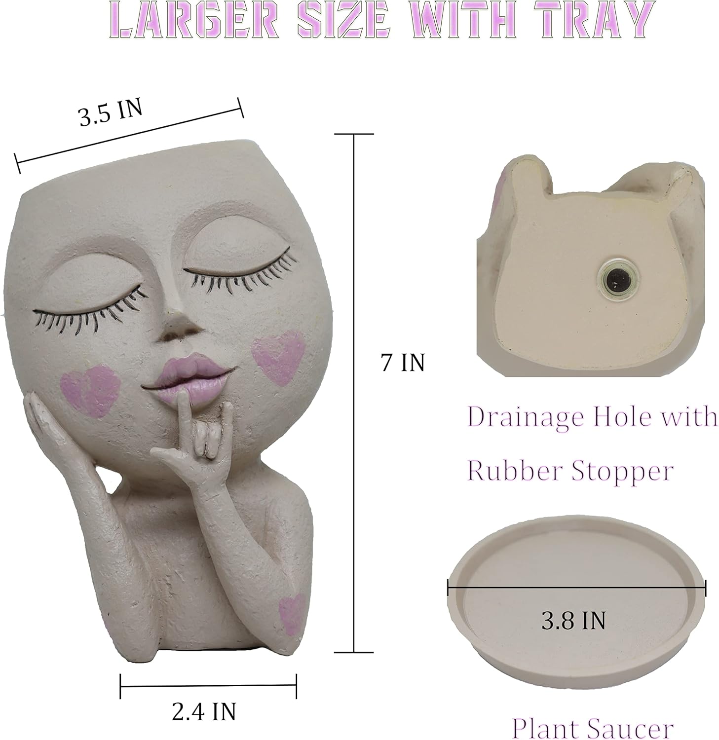 • ๐ŸŒต Size of Planter Pots: The size of this unique head vase is carefully designed by us. Based on sociology and aesthetics, we found this size to be the perfect way to make this vase funny and cute. The opening diameter of the flower planter is 3.5 inches, bottom length is 2.4 inches, height is 7 inches. The Diameter of the tray is 3.8 inches.