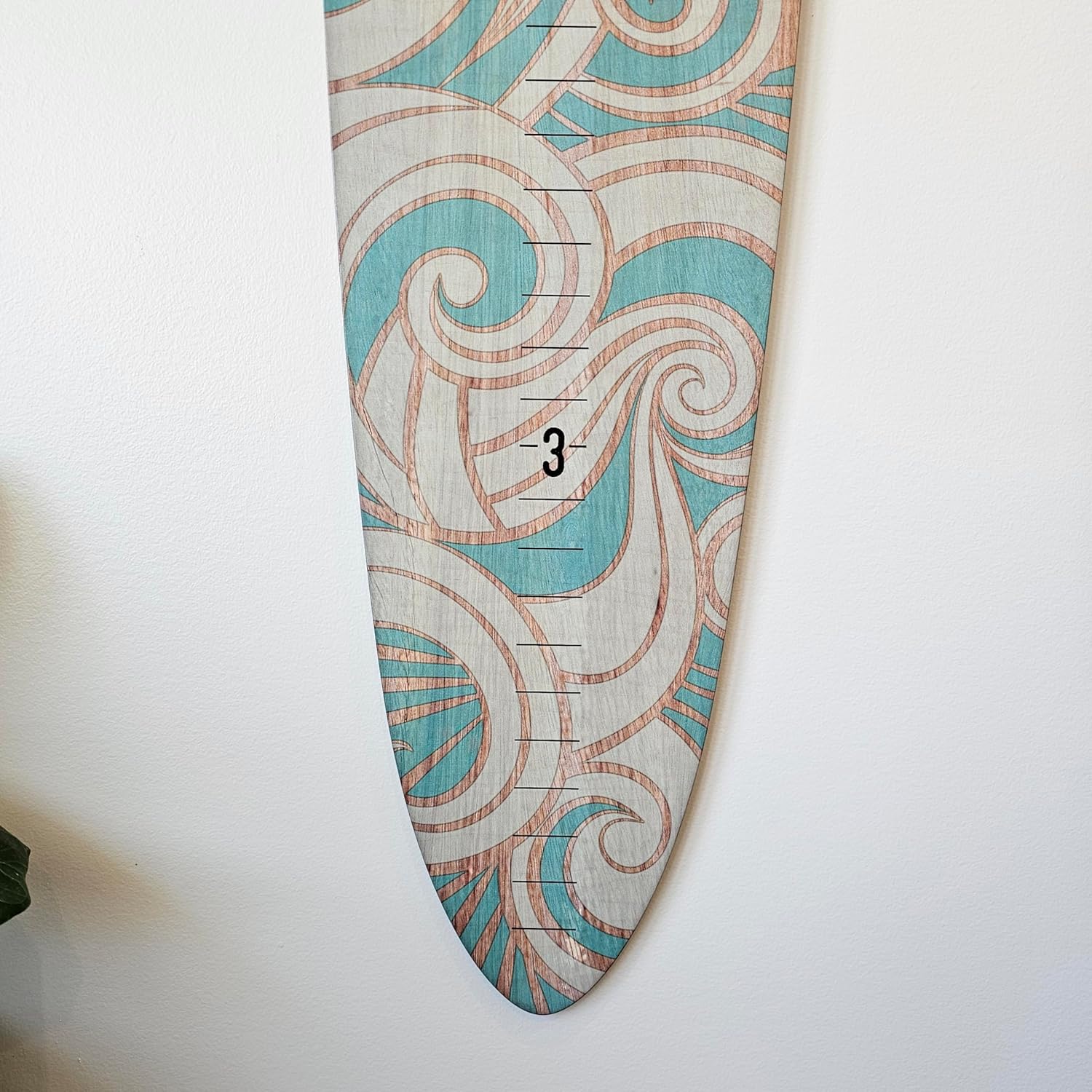 • Teal Wave, 9.5" x 45" Surfboard-inspired Growth Chart: A functional and stylish piece that blends seamlessly into nurseries, playrooms, and beach-themed spaces while serving as both decor and a way to track growth milestones.