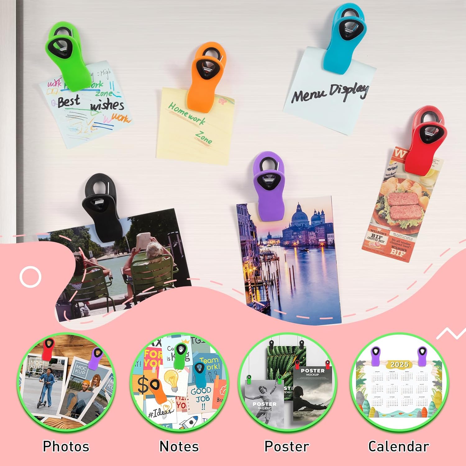 • Bright and vibrant colors: these portable refrigerator clips are available in 6 different colors, namely, purple, Black, orange, rose red, green and blue, classic and bright colors easily light up your mood and adding extra charm and vitality to your displaying artworks