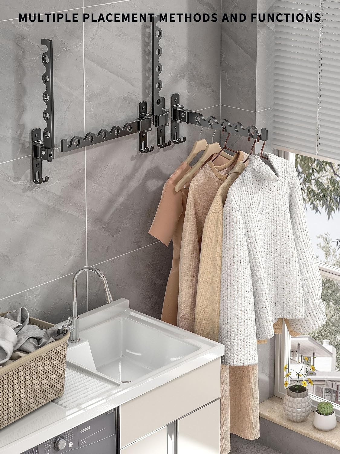 Dr.DJ Wall Hanger for Clothes, Coat Hanger Mounted Matte Black Retractable Clothes Drying Organizer Rack Garment Hooks Aluminium Folding Indoor Space Saver (2 Racks) Black