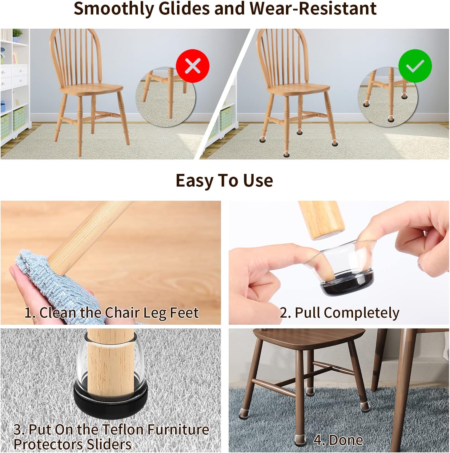 • ☛ 【Easy To Install & Reusable】- Just simply stretch and put them on. Table leg protectors pads for carpted floor are easy to install for anyone who has some grip strength. Chair Feet Protectors Caps for carpet is easy to clean, It can be reused.