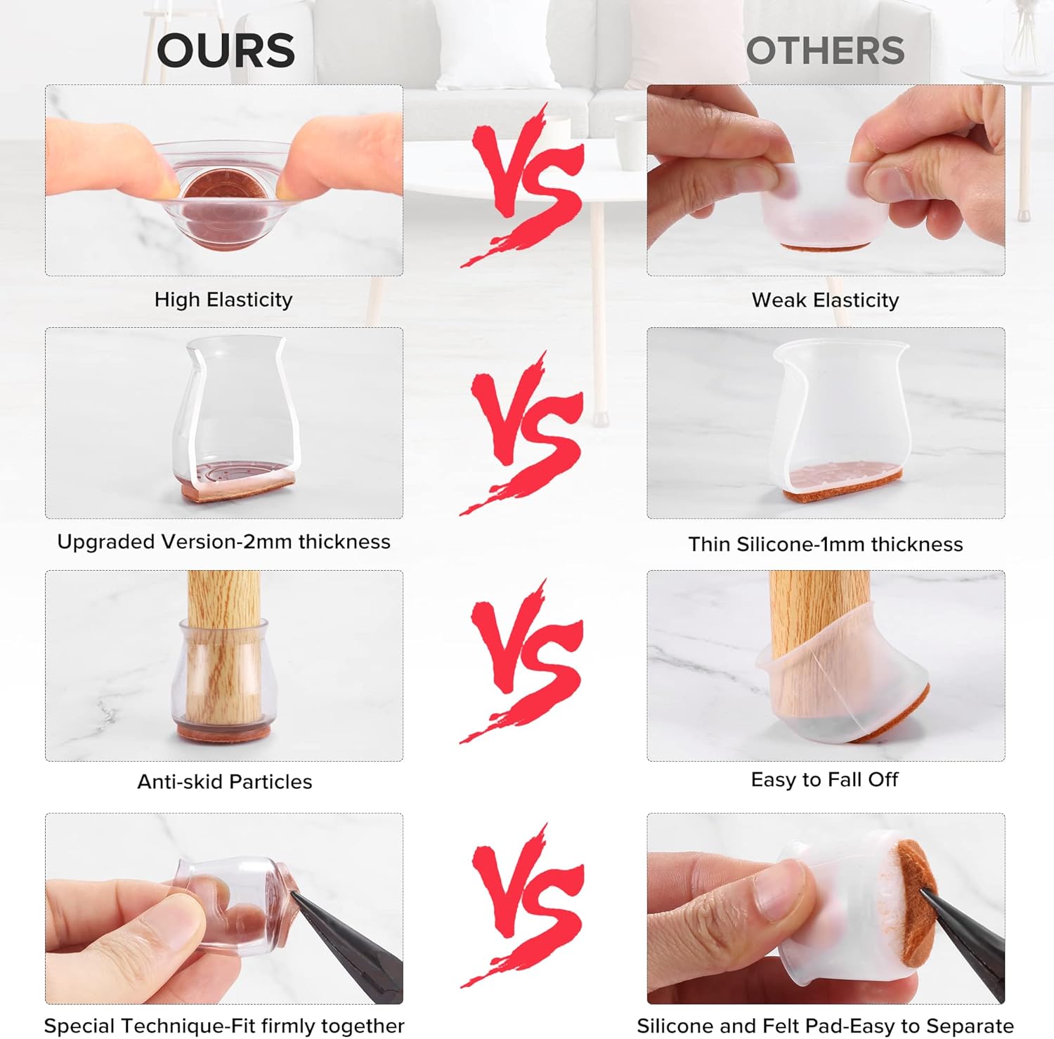 • ✅【Latest Upgrade】Compared with most of the traditional 1mm furniture pads on the market, our chair leg floor protectors are made of 2mm thick silicone, which will never be damaged, durable. The chair leg protectors will not change color when stretched. Inside of the inner sleeves are particles with anti-slip, which will firmly fix the chair and never make the covers fall off. Felt pads at the bottom make your furniture move silently and smoothly along floors without leaving marks and noise.