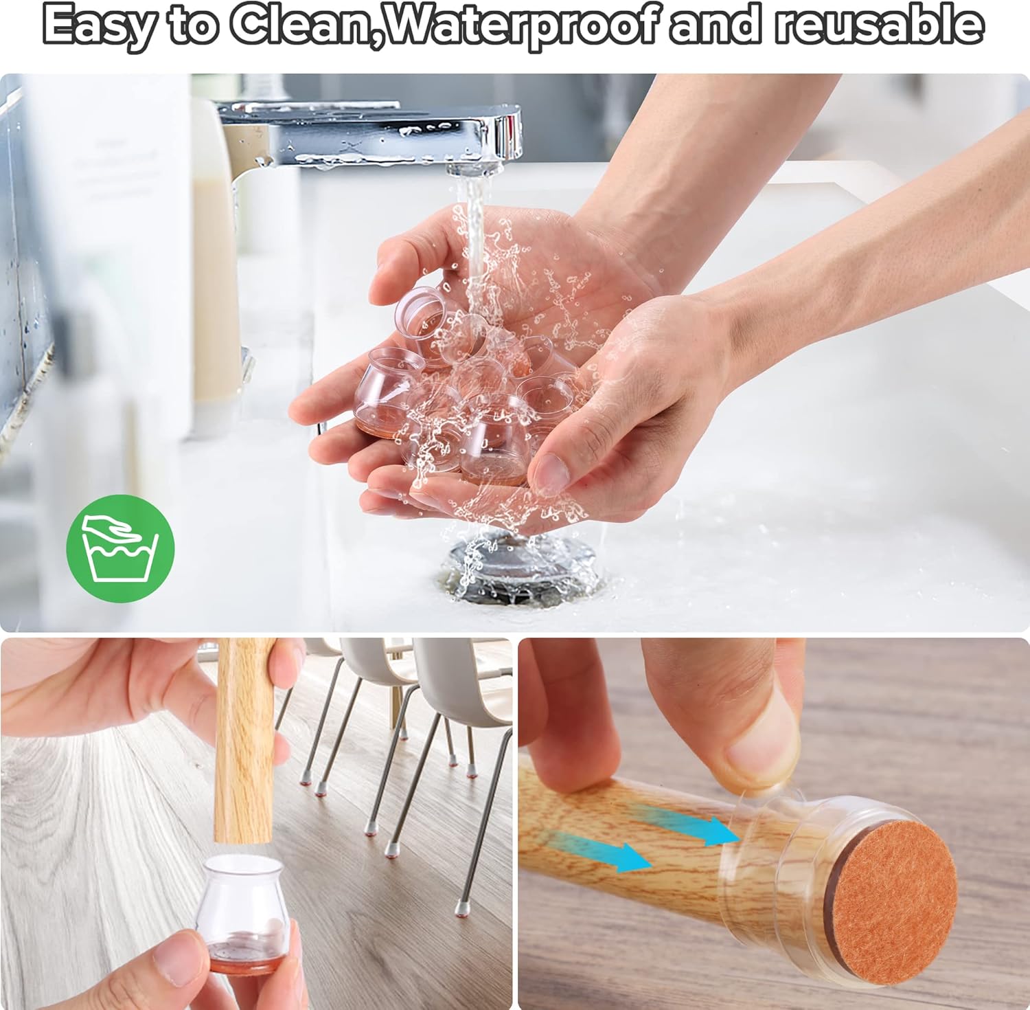 • ✅【Easy to Use】The chair leg covers to protect floors has high transparency, which greatly restore the original color of the table and chair legs, look more natural. The furniture leg cap is easy to install, without the use of tools. When the furniture chair socks are dirty, the chair stoppers can be cleaned and used repeatedly. Mainly suitable for smooth floors such as hardwood, tile, composite floor, and vinyl floor. Clear cap style match with most floors.
