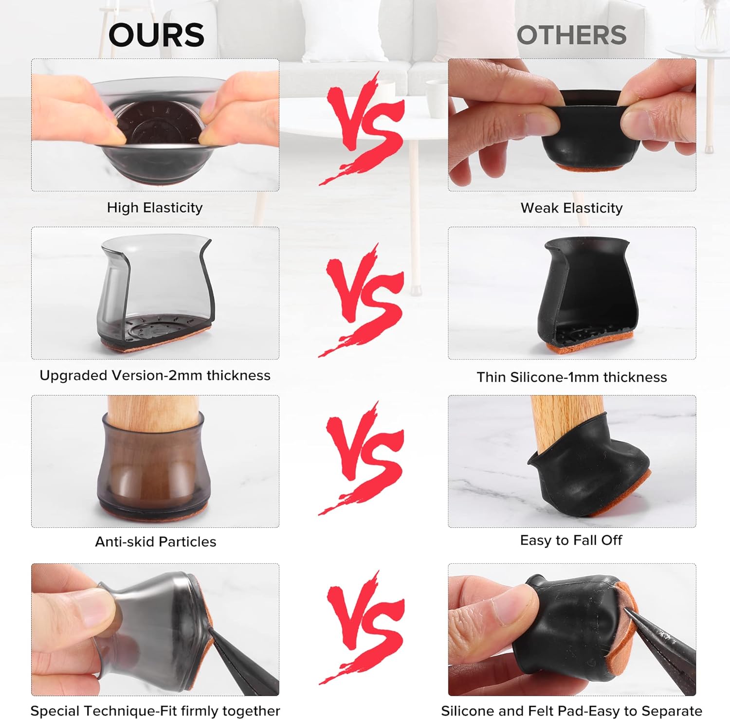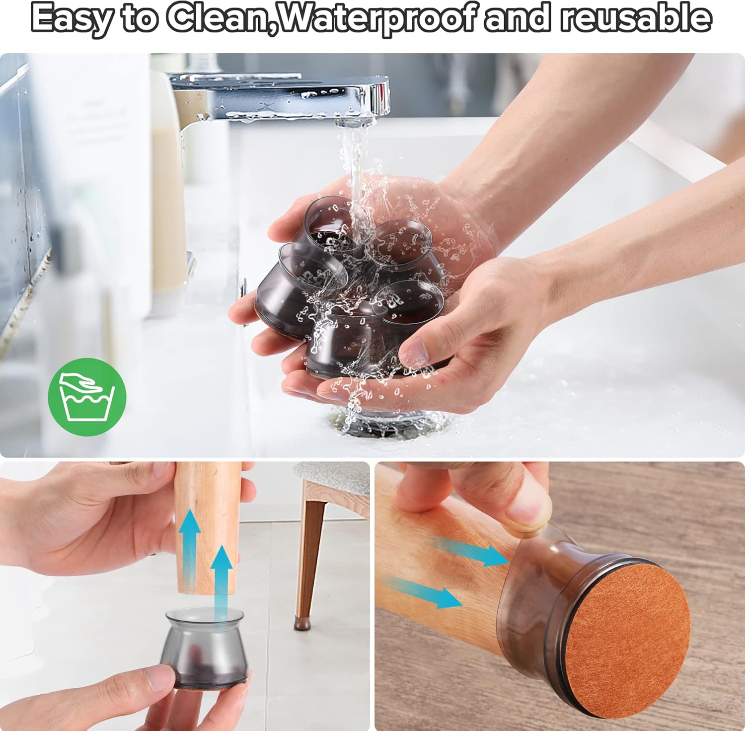 • ✅【Latest Upgrade】Compared with most of the traditional 1mm furniture pads on the market, our chair leg floor protectors are made of 2mm thick silicone, which will never be damaged, durable. The chair leg protectors will not change color when stretched. Inside of the inner sleeves are particles with anti-slip, which will firmly fix the chair and never make the covers fall off. Felt pads at the bottom make your furniture move silently and smoothly along floors without leaving marks and noise.