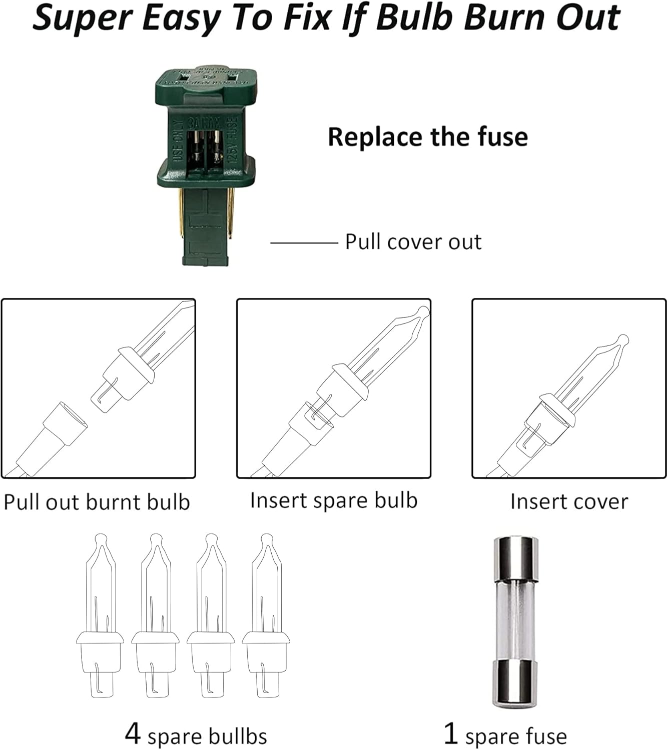 • Lights Size: The Christmas mini string lights includes 100 count incandescent light bulbs, the total length is 20 ft, the length of string light is 18.5 ft, lead wire is 1.5 ft, spacing between each light is 2.25 inches. The string light built-in 3A fuse and it is 120V high voltage with UL Certificated for safety, ensure the safety of you and your family. Package Includes: 1 x 20 ft light string, 1 x spare fuse, 4 x additional incandescent bulbs.