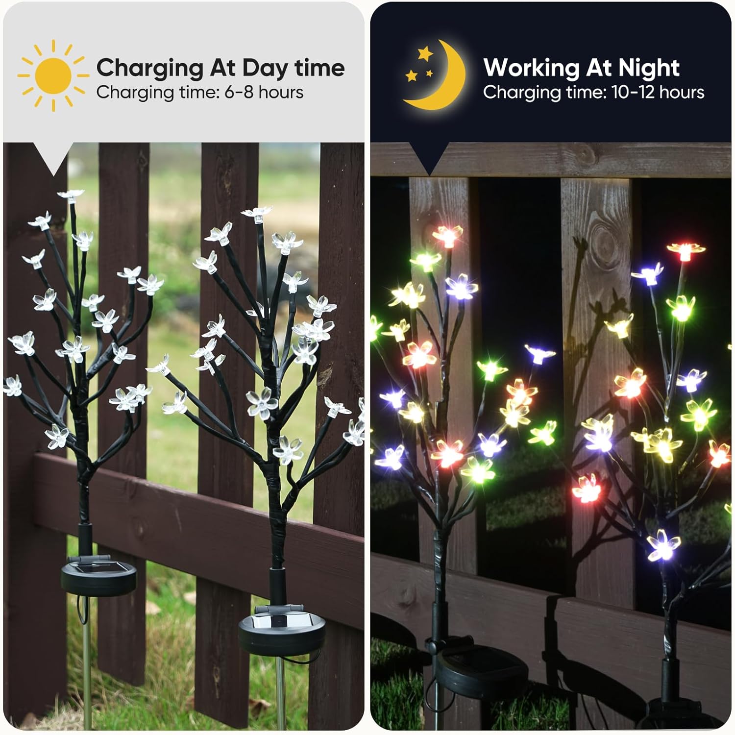 • 【Unique cherry blossom shape and durable】-Made of corrosion resistant material, the Solar Garden Lights Decorative are lighter and more durable. With 20Led super bright lights each, these solar lights garden will add a decorative touch to your garden decor for outside,The unique cherry blossom shape of these outdoor solar lights decorative is sure to attract the attention of neighbors and passers-by when they are on.