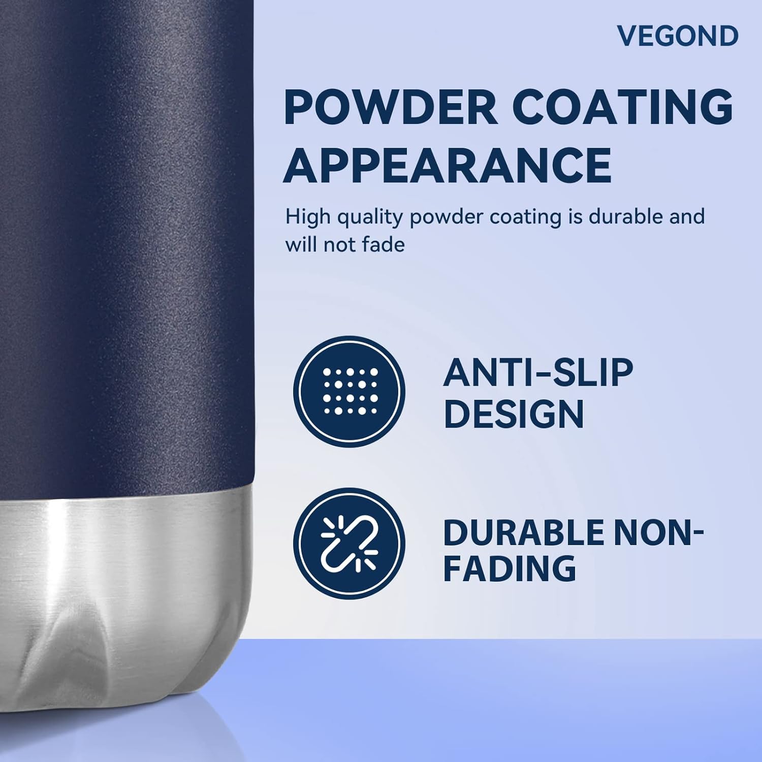 • All Day Heat / Cold Preservation : VEGOND double wall vacuum sports water bottles feature advanced heat preservation technology, keep your favorite drinks cold for up to 24 hours and hot for up to 12 hours. You can bring hot water, ice water, coffee, drinks with you. A 1.25”-diameter mouth accommodates small ice cubes and chopped fruits. The metal water bottle feature humanized design allows you to enjoy coolness in the hot summer and warmth in the cold winter