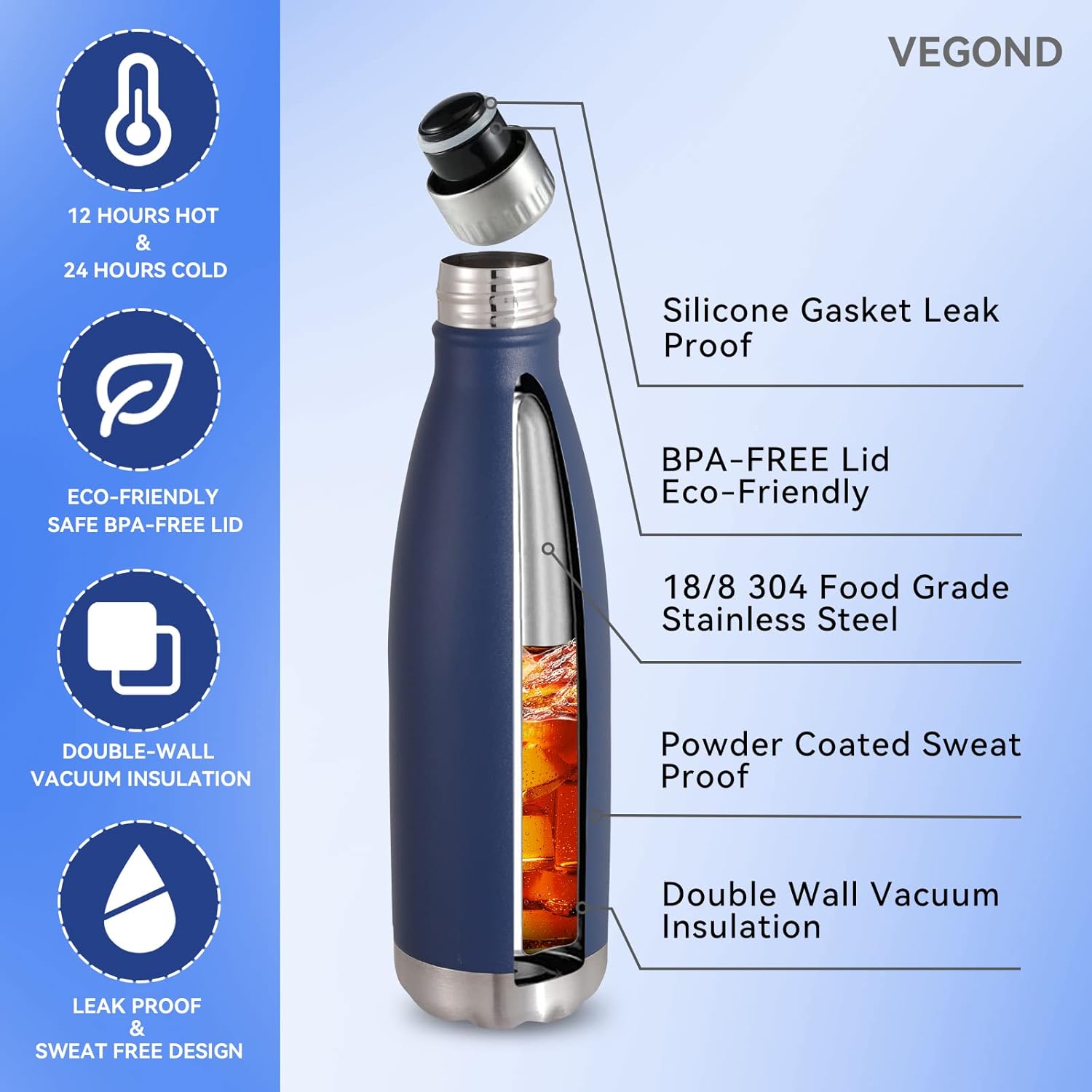 • All Day Heat / Cold Preservation : VEGOND double wall vacuum sports water bottles feature advanced heat preservation technology, keep your favorite drinks cold for up to 24 hours and hot for up to 12 hours. You can bring hot water, ice water, coffee, drinks with you. A 1.25”-diameter mouth accommodates small ice cubes and chopped fruits. The metal water bottle feature humanized design allows you to enjoy coolness in the hot summer and warmth in the cold winter