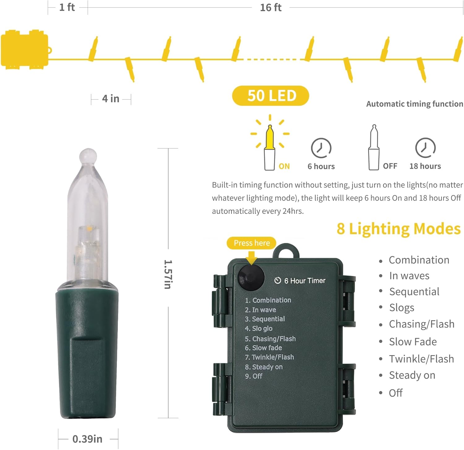 • [8 Lighting Modes]: WATERGLIDE 50LED Christmas warm white mini string lights have 8 lighting modes for you to choose - Combination, In waves, Sequential, Slow Glow, Chasing/Flash, Slow fade, Twinkle/Flash, Steady on. Adjust the lighting modes by pressing the round button on the battery case