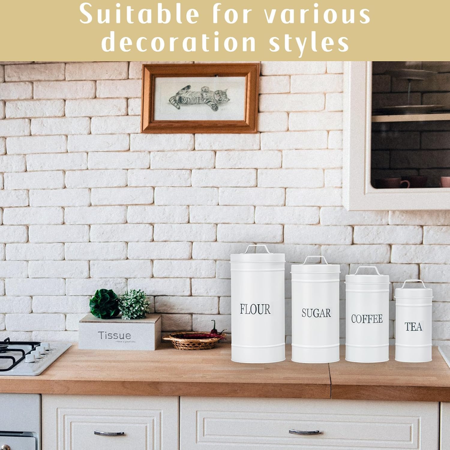 • Vintage Decorative Kitchen Tins - Ideal retro kitchen decor that is beautiful and functional. Not only will it add a farmhouse atmosphere to your kitchen countertop, but it will also keep your kitchen organized.