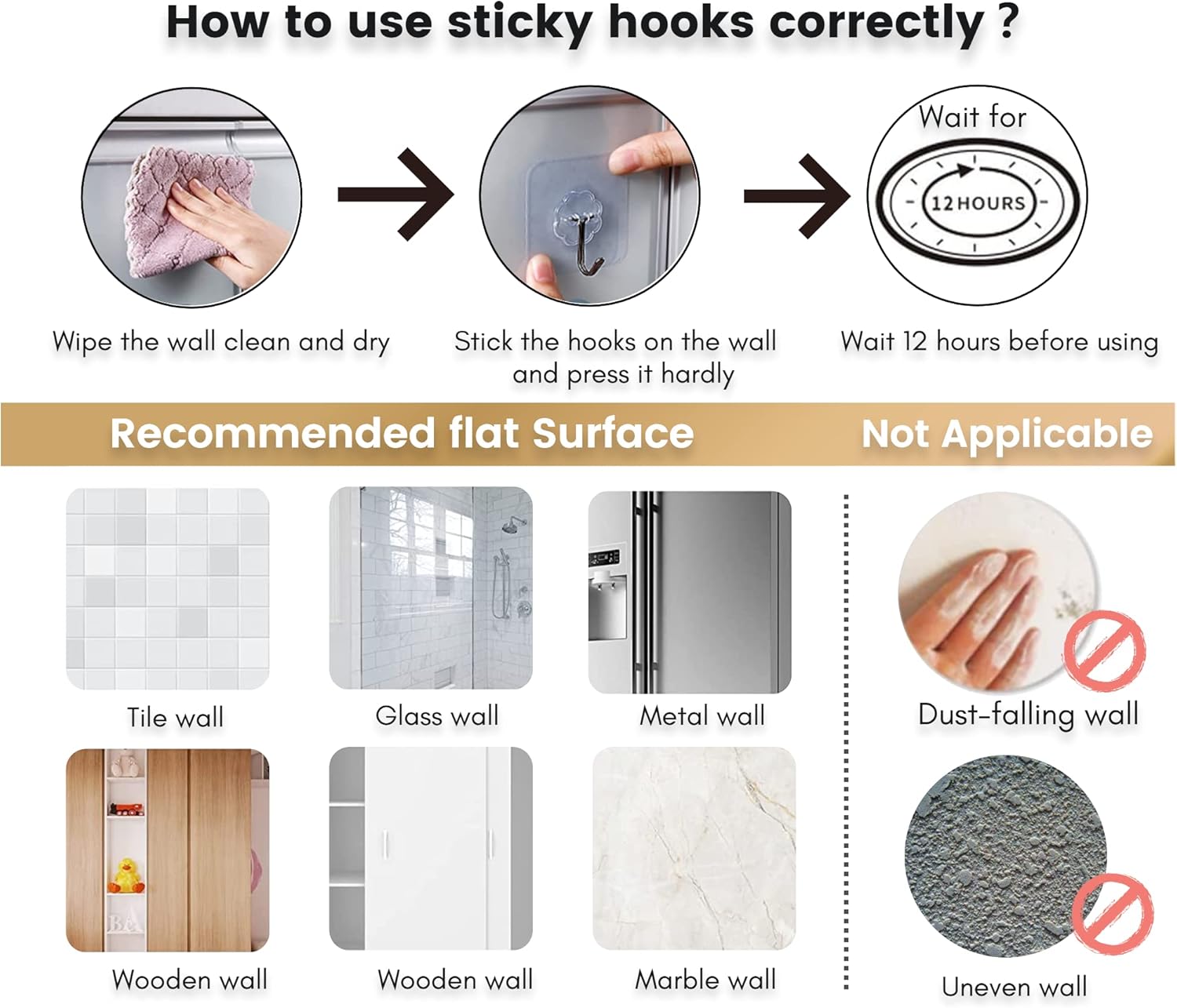 • 【How to Use】1) Stick the hook on any smooth clean dry surface and press it tightly to remove any bubbles. 2) Wait 12 hours to adhere the hook firmly. 3) Finally, you can hang the hanging bag on the hook to enjoy it.