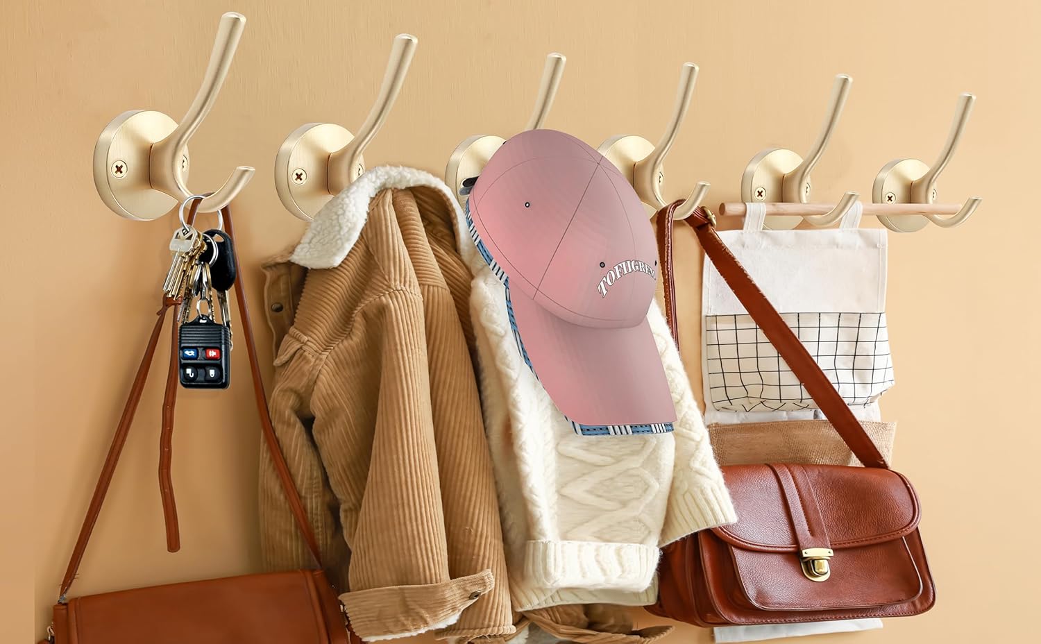 Gold Wall Hooks, 6 Pack Coat Robe Hook Heavy Duty Metal Double Bath Hook Wall Mounted, Hand Towel Hooks for Cubicle Bathroom Kitchen Closet Garage