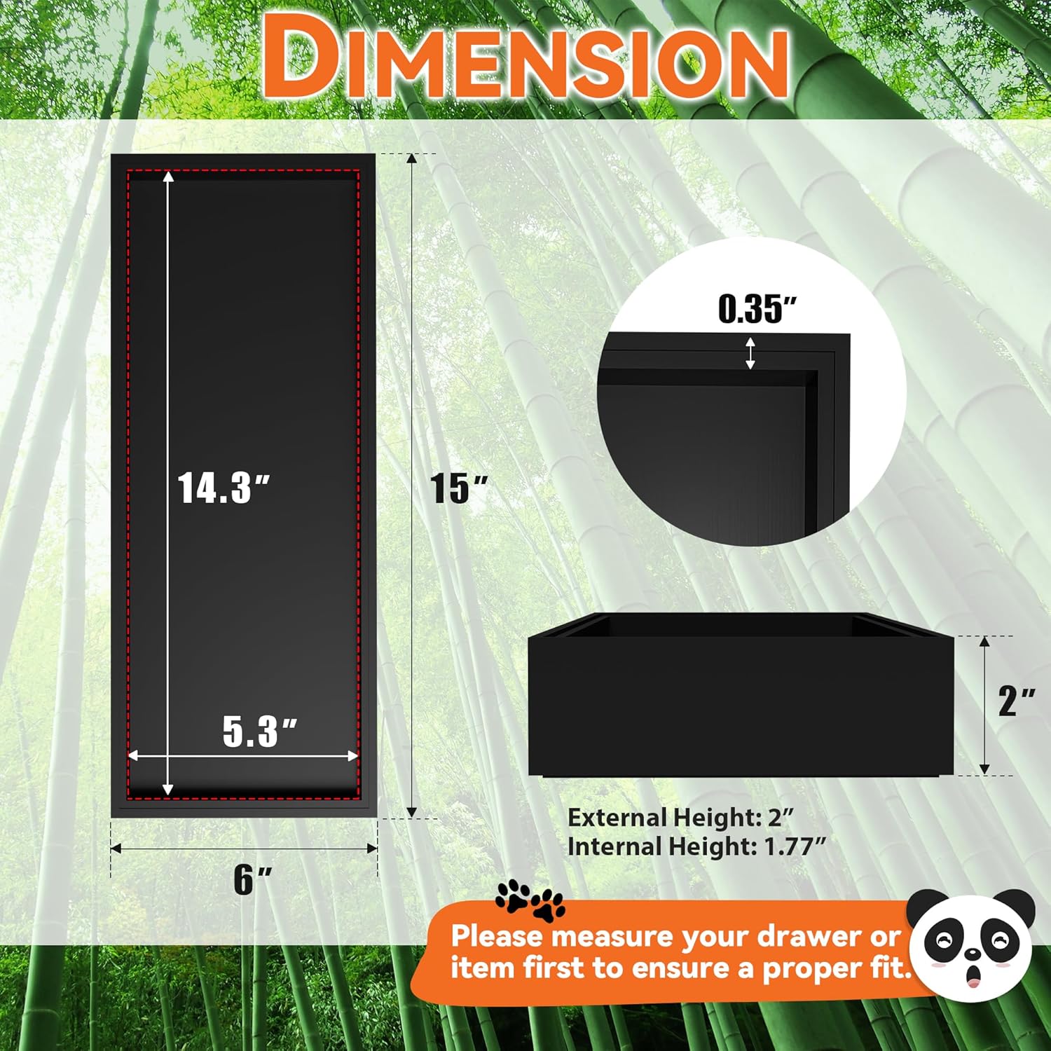 • Each bamboo drawer organizer measures: external size: 15" L x 6" W x 2" H; internal size: 14.3" L x 5.3" W x 1.77" H. Please check the size before purchasing