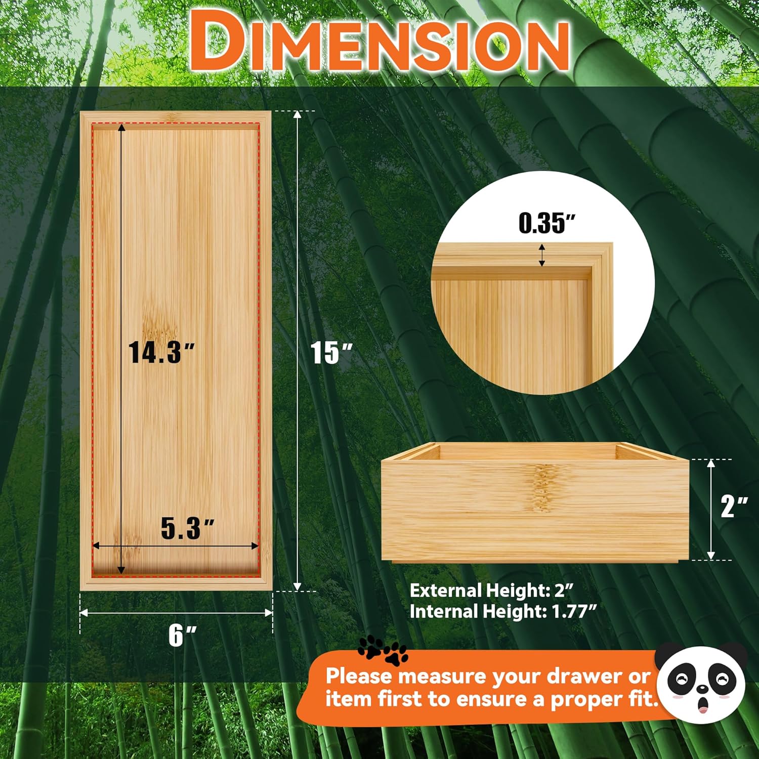 • Each bamboo drawer organizer measures: external size: 15" L x 6" W x 2" H; internal size: 14.3" L x 5.3" W x 1.77" H. Please check the size before purchasing