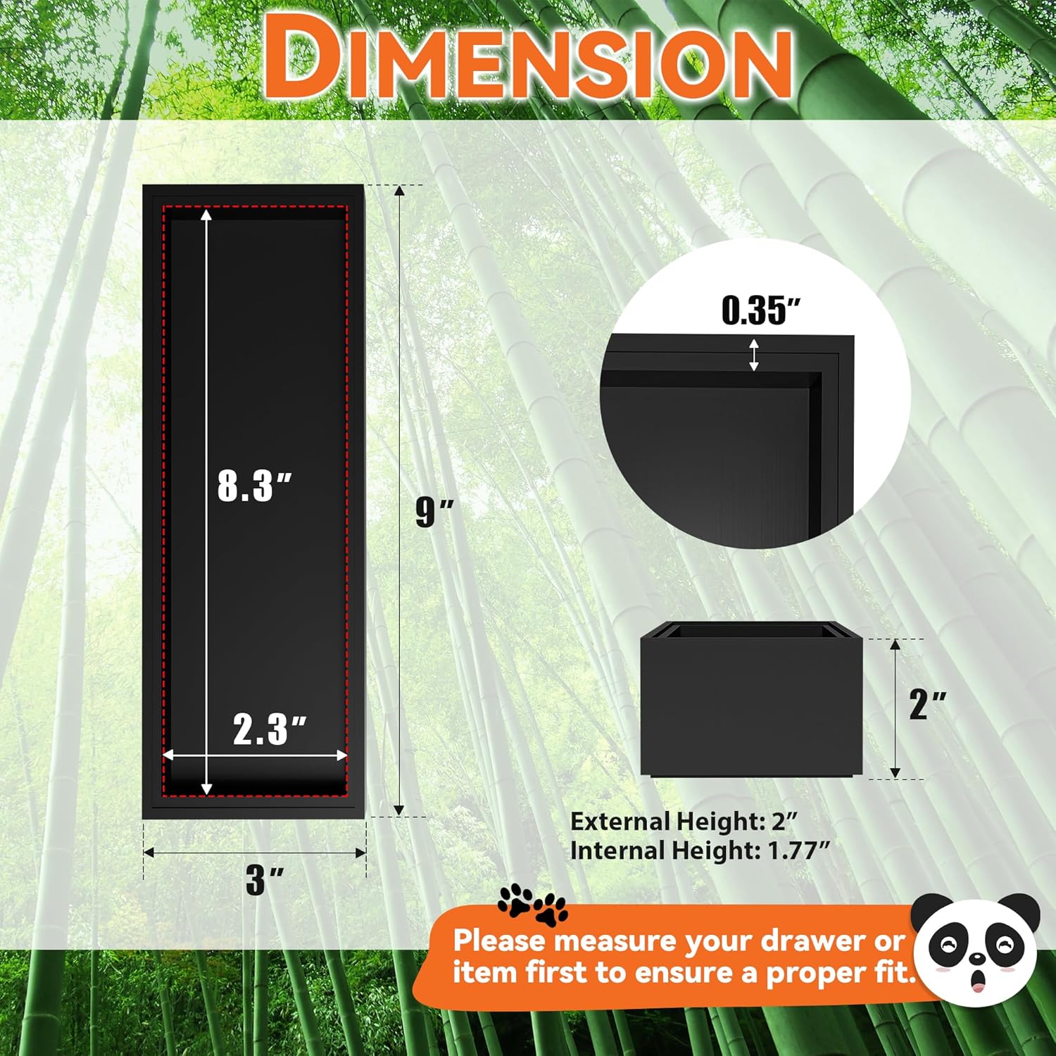 • Each bamboo drawer organizer measures: external size: 9" L x 3" W x 2" H; internal size: 8.3" L x 2.3" W x 1.77" H. Please check the size before purchasing