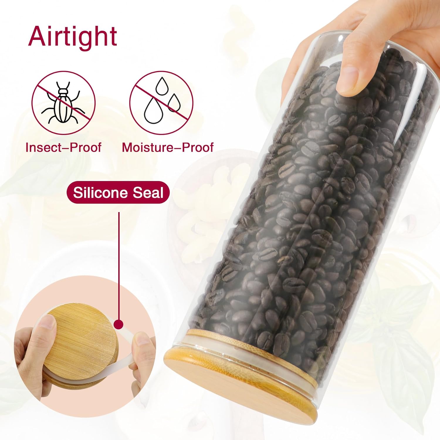 • 【Airtight &Moistureproof】These food storage jars utilize precision bamboo lid with silicone rings to create an airtight seal. The moisture-proof glass storage jars with bamboo lids effectively block ants while preserving freshness in kitchen food jars & canisters.