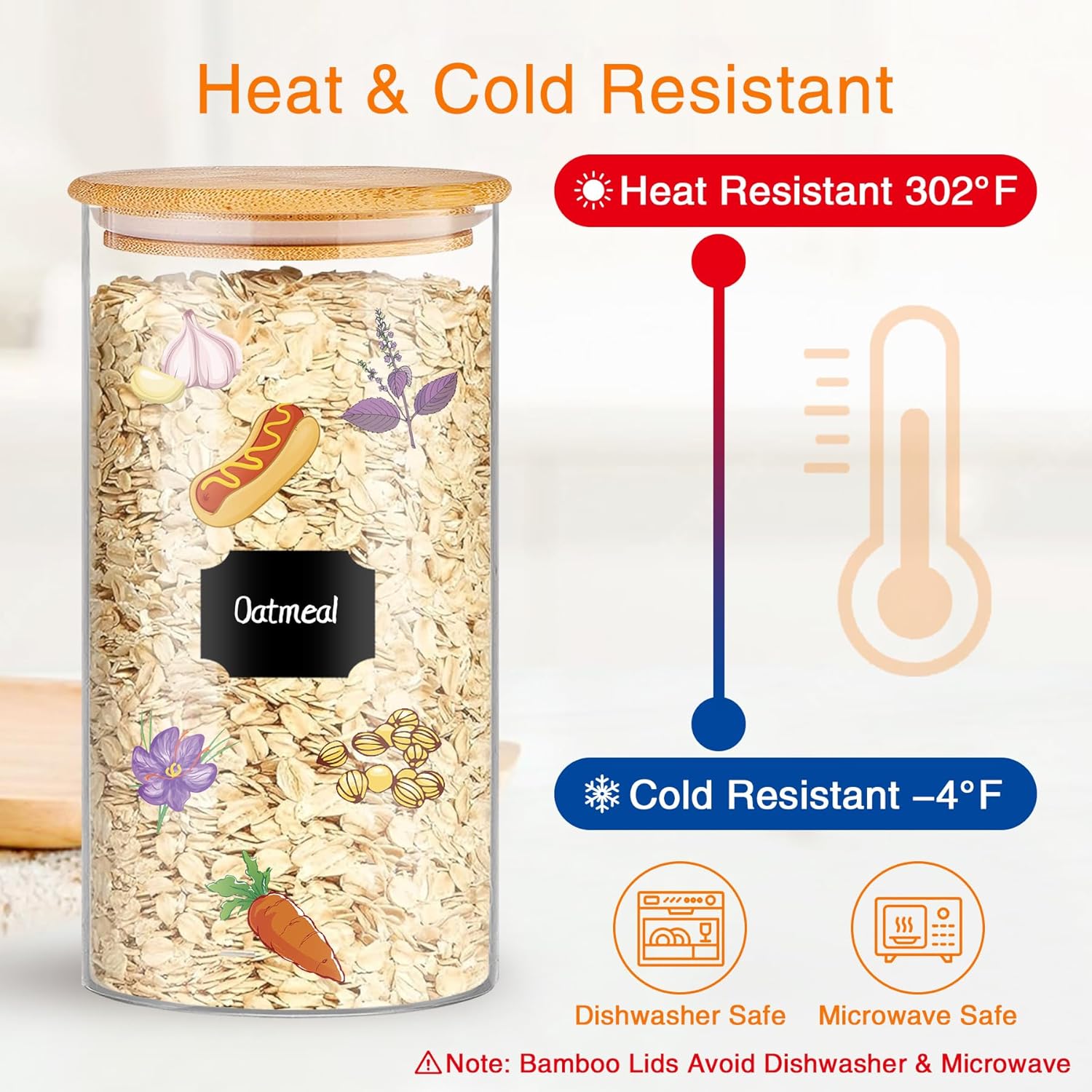• 【Effortless Organization】Stay perfectly organized with 58 colorful labels included with these kitchen jars. The uniform airtight glass pantry storage containers set with bamboo lids stack neatly to maximize space - ideal for small kitchens storing flour, nuts or pet treats.
