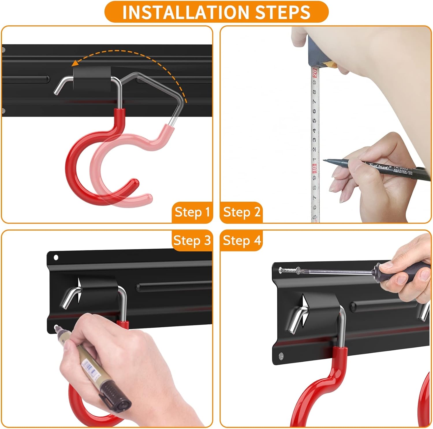 • QUICK & EASY INSTALLATION: Installation is a breeze, it comes with the screws and anchors needed to put it basically anywhere in the garage where you have room. The mounting holes are 16" apart! Perfect for studs. If your studs are not 16", it will be better to put additional 2x4 wood to mount the garage wall hooks. You just slip the handle on and it immediately locks in, extremely easy to use.