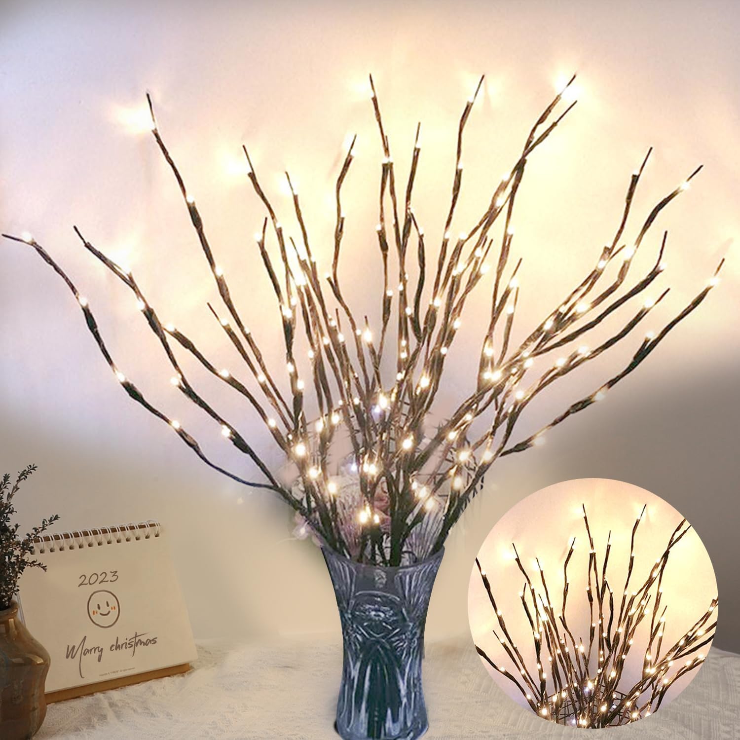 • 【 Specification】 -- Each decorative willow twig lights comes with 5 bendable stems, 30 inches total length, and 20 led white light bulbs. 2 packs of branch lights together to make the foliage look more lush.