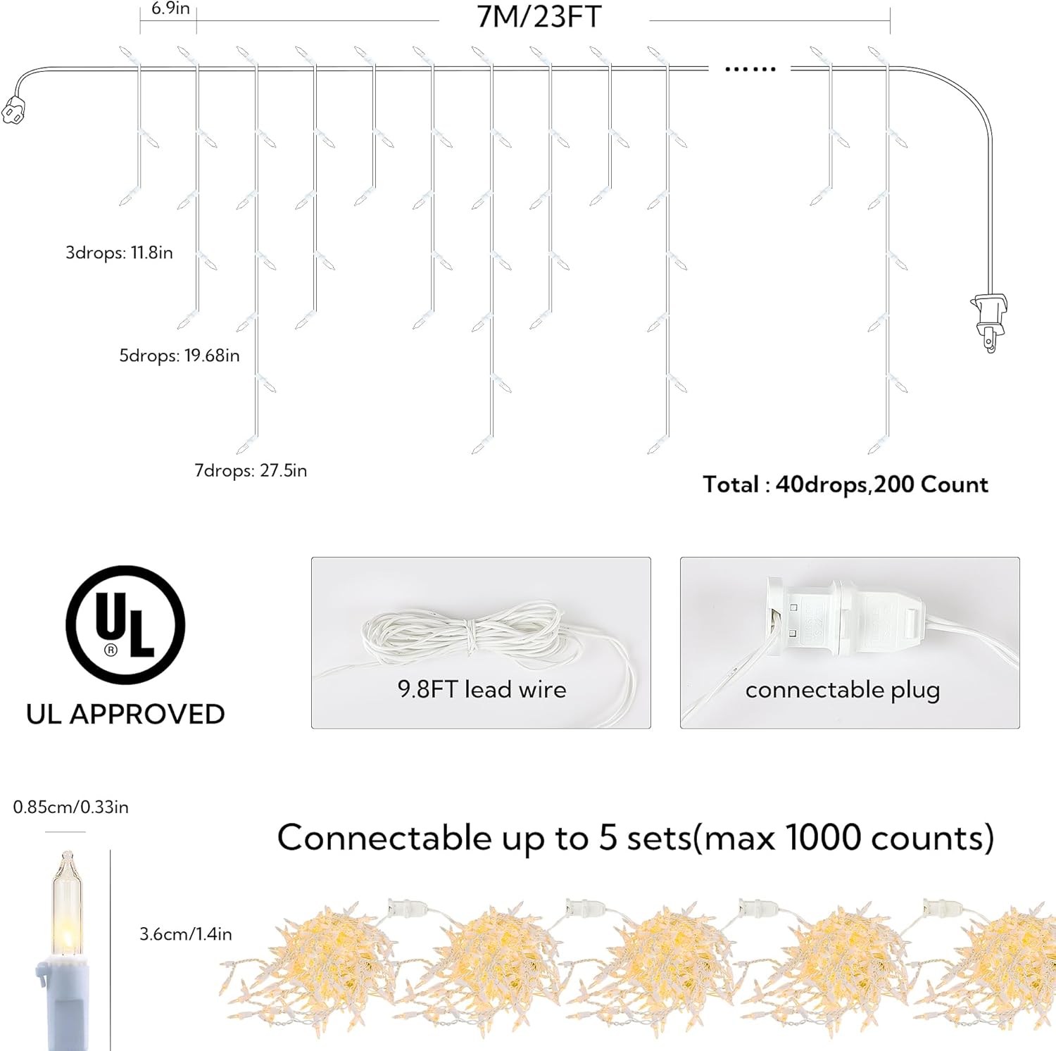 • ⛄*Incandescent Christmas Icicle Lights*-Bright 200 traditional clear incandescent icicle lights on white wire,32.8ft total length(Wire with light 23ft+Lead wire 9.8ft) with 40 drops,with 3/5/7 bulbs each drop,the drop spacing is 5.9 inch, bulb spacing is 4.3 inch.Hanging Beewin warm white icicle lights to create an warm romantic and charming atmosphere!