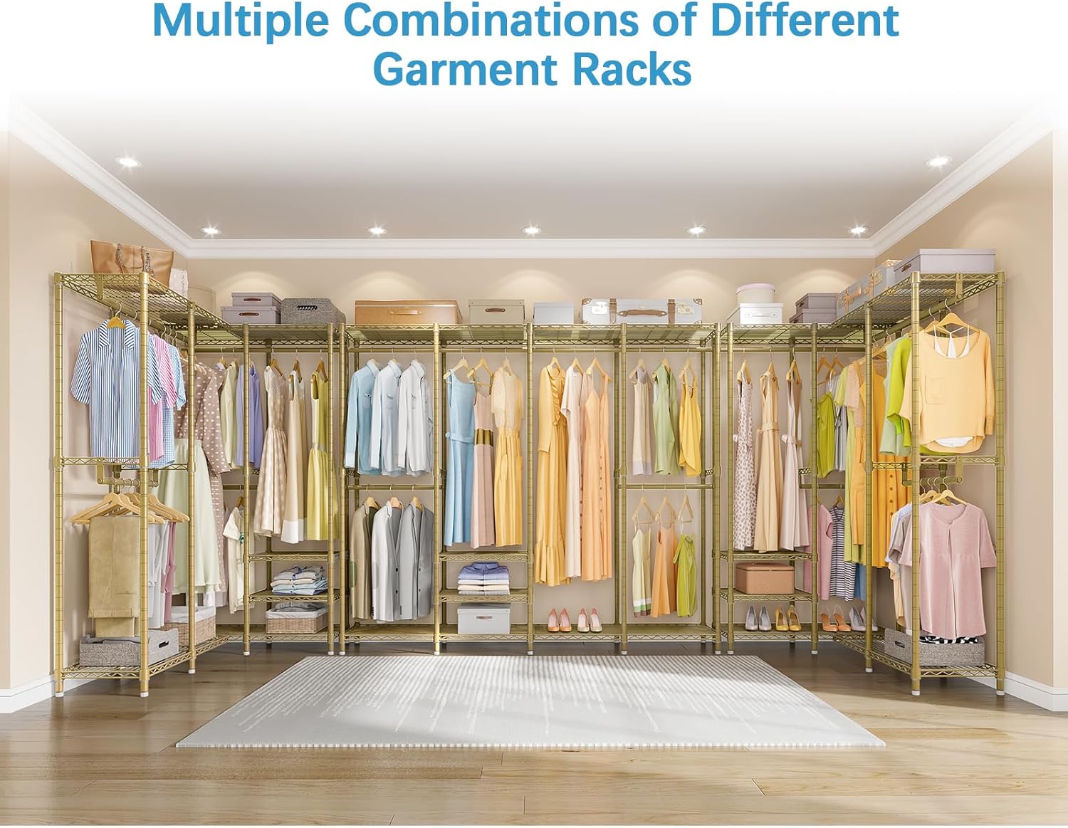 • All-in-one Multifunction Closet Rack: 4 Tiers Extra Large Garment Rack V40 offers you various storage area to place your clothes, accessories, shoes, etc. It features 6 height adjustable shelves for extra storage capacity, 4 detachable hanging bars that easily accommodates to the length and size of your garments.
