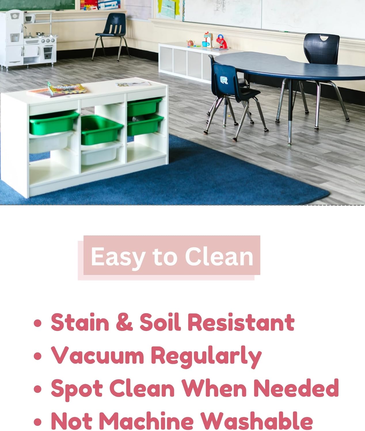 • Durable and versatile classroom area rug: This custom cut low-pile rug is ideal for classrooms, play areas, and high-traffic zones. Its durable, stain-resistant surface makes it easy to maintain, while the custom sizing ensures a perfect fit in any learning or activity space. A great area rug solution for schools, daycares, or home learning environments.