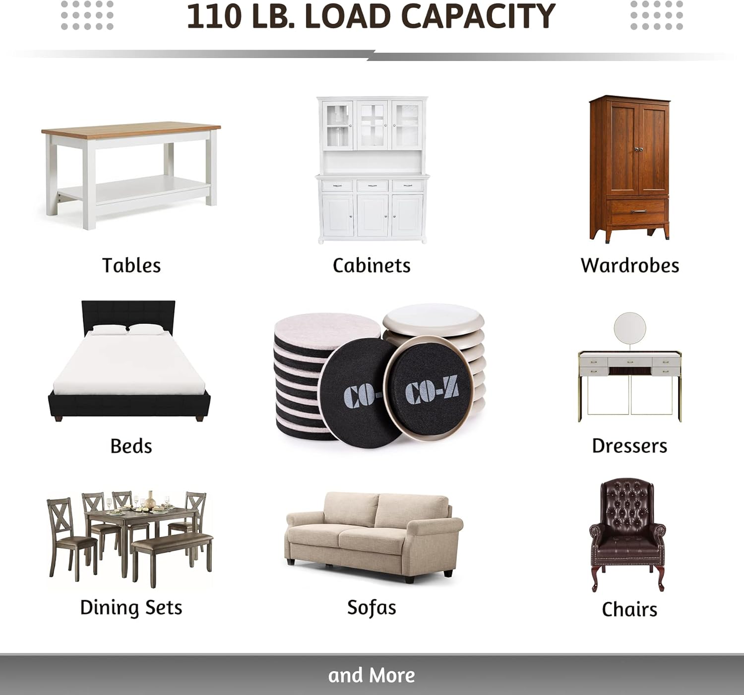 • 16-Piece Moving Kit: This CO-Z round furniture slider kit supports up to 110 lb., making it easy to move large heavy furniture across hardwood floors or carpet. With a 3.5" diameter, it's perfect for chairs, beds, cabinets, and other furniture legs