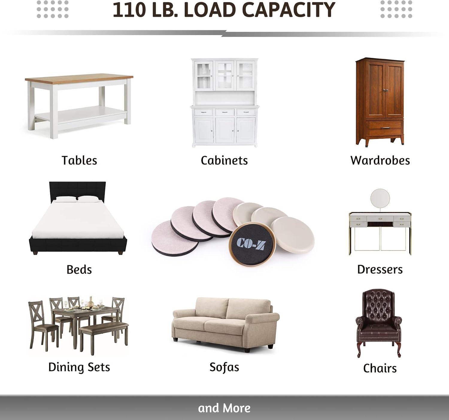 • 8-Piece Moving Kit: This CO-Z round furniture slider kit supports up to 110 lb., making it easy to move large heavy furniture across hardwood floors or carpet. With a 3.5" diameter, it's perfect for chairs, beds, cabinets, and other furniture legs