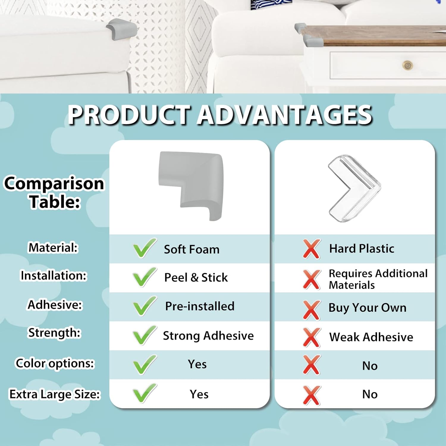 • Child-Friendly Material: Our baby proofing edge guards is fully compliant with US and EU child safety regulations. Free of BPA, Phthalate, Latex, Lead and SCCPs, which makes it a great choice for daycare centers, schools, nurseries and your family.